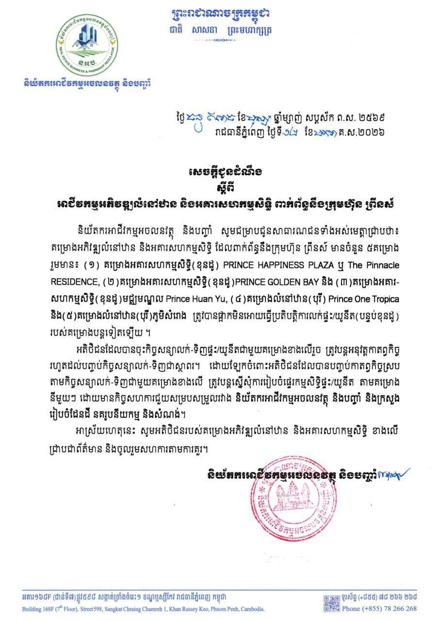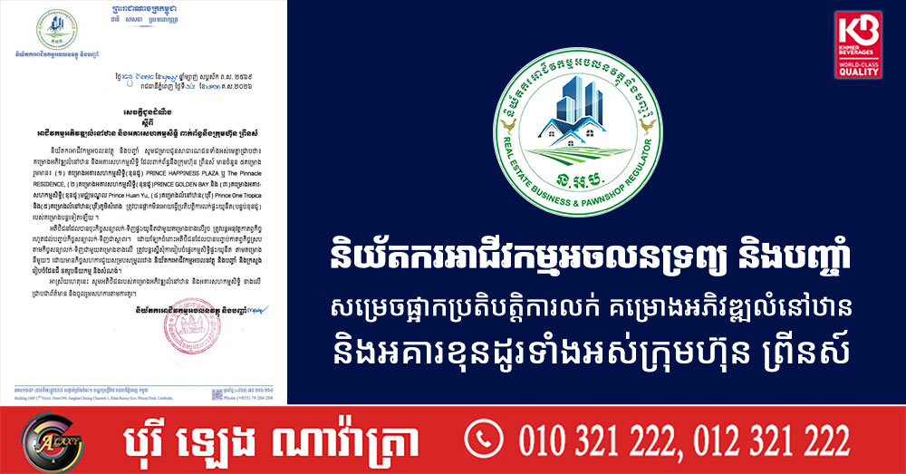 និយ័តករអាជីវកម្មអចលនទ្រព្យ និងបញ្ចាំ សម្រេចផ្អាកប្រតិបត្តិការលក់ គម្រោងអភិវឌ្ឍលំនៅឋាន និងអគារខុនដូរទាំងអស់ក្រុមហ៊ុន ព្រីនស៍