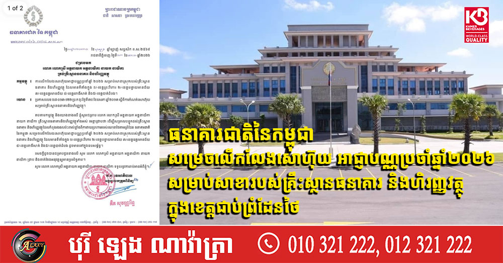 ធនាគារជាតិនៃកម្ពុជា សម្រេចលើកលែងសោហ៊ុយ អាជ្ញាបណ្ណប្រចាំឆ្នាំ២០២៦ សម្រាប់សាខារបស់គ្រឹះស្ថានធនាគារ និងហិរញ្ញវត្ថុ ក្នុងខេត្ដជាប់ព្រំដែនថៃ (Video inside)