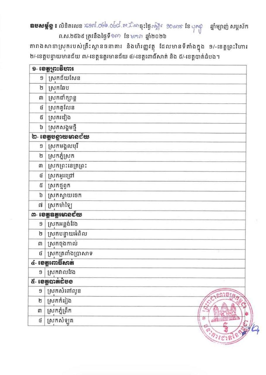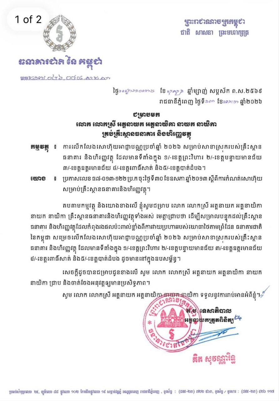 ក្នុងលិខិតបានបញ្ជាក់ថា «ដើម្បីសម្រាលបន្ទុកដល់គ្រឹះស្ថាន ធនាគារ និងហិរញ្ញវត្ថុ ដែលកំពុងរងផលប៉ះពាល់ខ្លាំង ពីការវាយប្រហាររបស់យោធាថៃ តាមព្រំដែន ធនាគារជាតិនៃកម្ពុជា សម្រេចលើកលែងសោហ៊ុយ អាជ្ញាបណ្ណប្រចាំឆ្នាំ២០២៦ សម្រាប់សាខាស្រុករបស់គ្រឹះស្ថាន ធនាគារ និងហិរញ្ញវត្ថុ ដែលមានទីតាំងក្នុង ១/-ខេត្តព្រះវិហារ ២/-ខេត្តបន្ទាយមានជ័យ ៣/-ខេត្តឧត្តរមានជ័យ ៤/-ខេត្តពោធិ៍សាត់ និង៥/-ខេត្តបាត់ដំបង ដូចមាននៅក្នុងឧបសម្ព័ន្ធ»៕