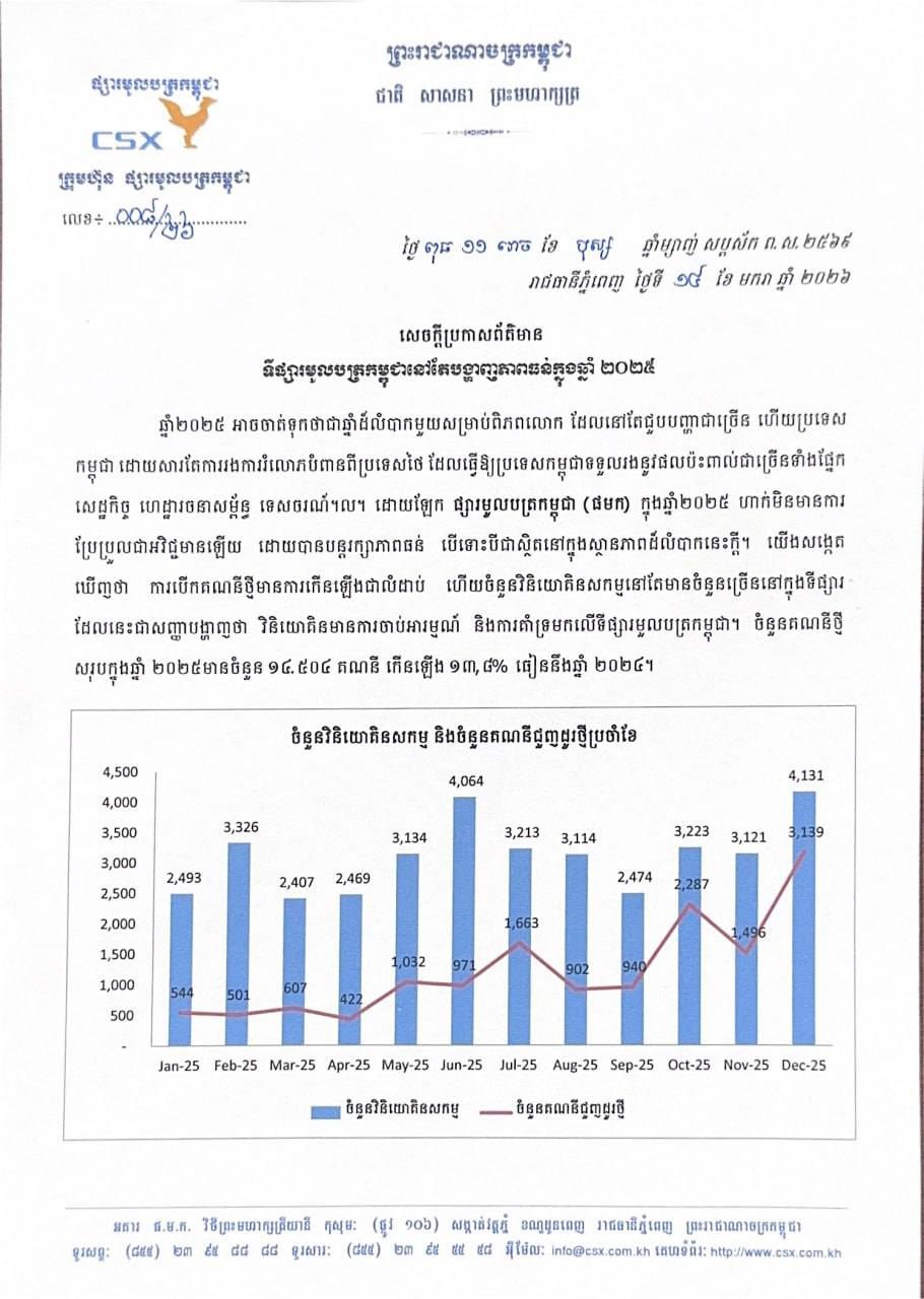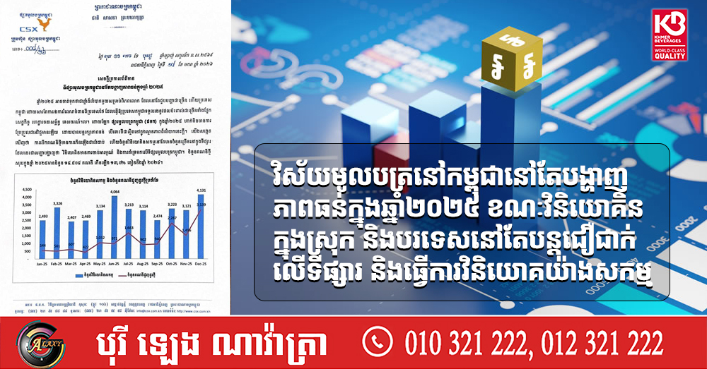 វិស័យមូលបត្រនៅកម្ពុជានៅតែបង្ហាញភាពធន់ក្នុងឆ្នាំ២០២៥ ខណៈវិនិយោគិនក្នុងស្រុក និងបរទេសនៅតែបន្តជឿជាក់លើទីផ្សារ និងធ្វើការវិនិយោគយ៉ាងសកម្ម