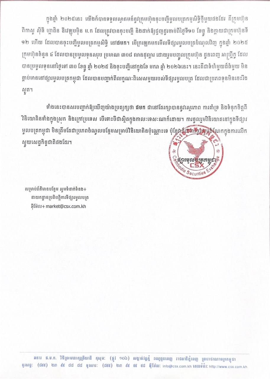 CSX បានឱ្យដឹងដែរថា «ក្នុងឆ្នាំ ២០២៥នេះ យើងក៏បានទទួលស្វាគមន៍នូវក្រុមហ៊ុនចុះបញ្ជីមូលបត្រកម្មសិទ្ធិថ្មីមួយផងដែរ គឺក្រុមហ៊ុន ពីកាសូ ស៊ីធី ហ្គាដិន ឌីវេឡុបម៉ិន ម.ក ដែលត្រូវបានចុះបញ្ជី និងដាក់ឱ្យជួញដូរចាប់ពីថ្ងៃទី១០ ខែធ្នូ និងក្លាយជាក្រុមហ៊ុនទី១ ហើយ ដែលបានចុះបញ្ជីមូលបត្រកម្មសិទ្ធិ នៅផមក»។