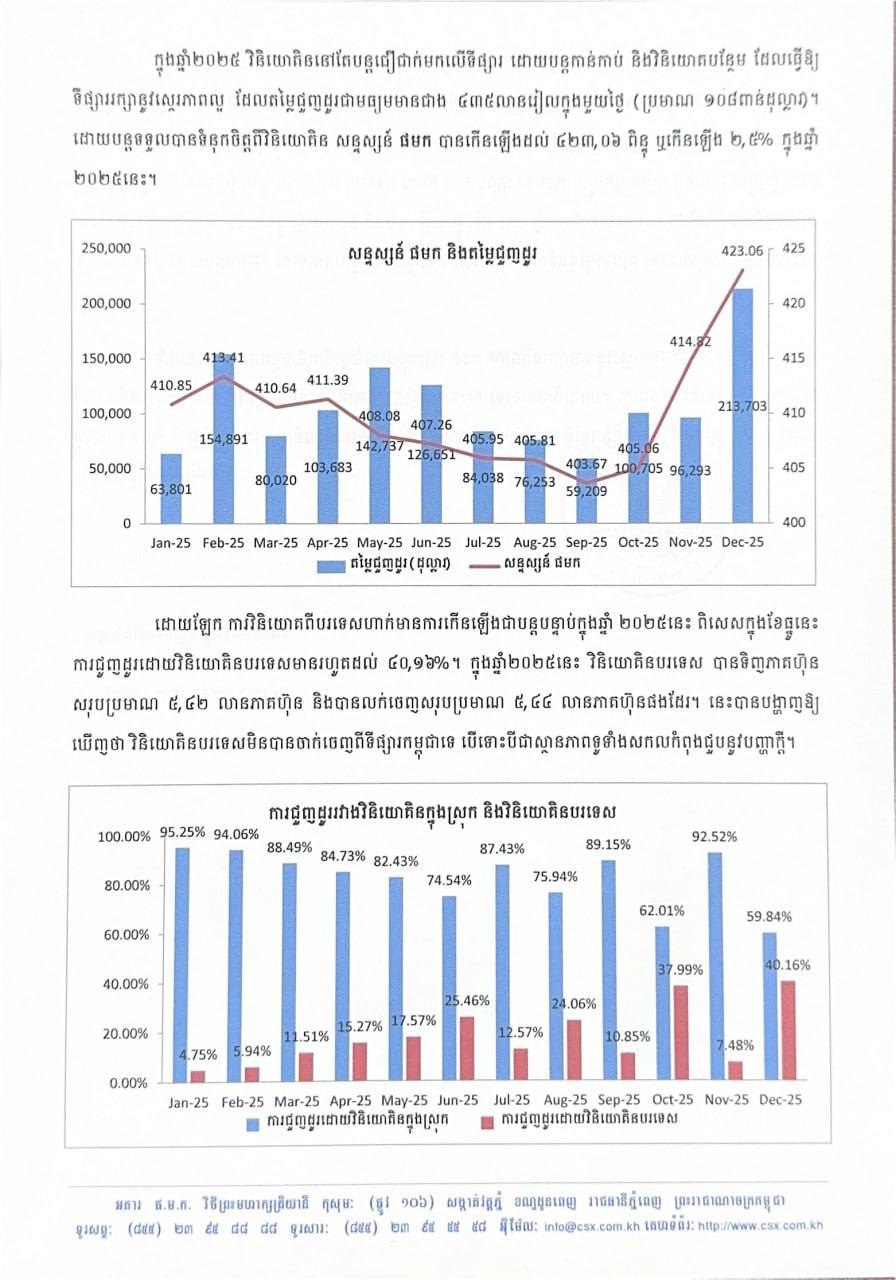 ដោយឡែក ការវិនិយោគពីបរទេសហាក់មានការកើនឡើងជាបន្តបន្ទាប់ក្នុងឆ្នាំ ២០២៥នេះ ពិសេសក្នុងខែធ្នូនេះ ការជួញដូរដោយវិនិយោគិនបរទេសមានរហូតដល់ ៤០,១៦%។ ក្នុងឆ្នាំ២០២៥នេះ វិនិយោគិនបរទេស បានទិញភាគហ៊ុន សរុបប្រមាណ ៥,៤២ លានភាគហ៊ុន និងបានលក់ចេញសរុបប្រមាណ ៥,៤៤ លានភាគហ៊ុនផងដែរ។ នេះបានបង្ហាញឱ្យ ឃើញថា វិនិយោគិនបរទេសមិនបានចាក់ចេញពីទីផ្សារកម្ពុជាទេ បើទោះបីជាស្ថានភាពទូទាំងសកលកំពុងជួបនូវបញ្ហាក្តី។