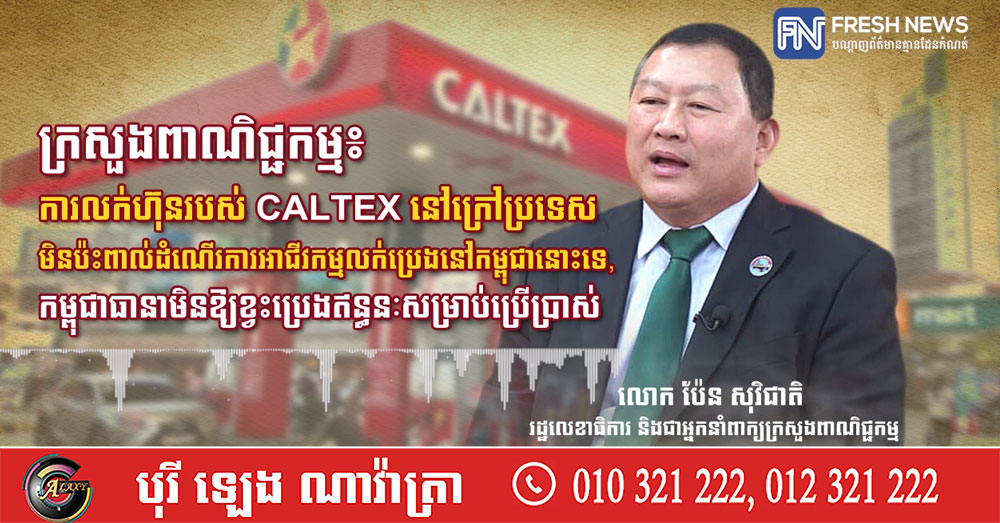 (ភ្នំពេញ)៖ លោក បែន សុវិជាតិ រដ្ឋលេខាធិការ និងជាអ្នកនាំពាក្យក្រសួងពាណិជ្ជកម្ម នៅថ្ងៃទី២៧ ខែមករា ឆ្នាំ២០២៦នេះ តាមរយៈបណ្តាញព័ត៌មាន Fresh News សូមជម្រាបជូនដល់បងប្អូនប្រជាពលរដ្ឋខ្មែរ កុំឱ្យព្រួយបារម្ភ ចំពោះព័ត៌មានអំពីក្រុមហ៊ុនអាមេរិក Chevron ដែលគ្រោងលក់ទ្រព្យសម្បត្តិប្រេងនៅតំបន់អាស៉ី ក្នុងនោះអាចរួមមានទាំងស្ថានីយឥន្ធនៈ Caltex នៅកម្ពុជាផងដែរនោះ។