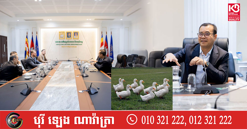 (ភ្នំពេញ)៖ បណ្ឌិត កៅ ថាច ប្រតិភូរាជរដ្ឋាភិបាលទទួលបន្ទុក ជាអគ្គនាយកធនាគារអភិវឌ្ឍន៍ជនបទ និងកសិកម្ម (ARDB) នៅថ្ងៃទី២៧ ខែមករា ឆ្នាំ២០២៦ បានអនុញ្ញាតជូនតំណាងក្រុមហ៊ុន Maple Leaf Farms ចូលជួបសម្តែងការគួសម និងពិភាក្សាការងារ នៅទីស្នាក់ការកណ្តាលធនាគារ ARDB ដោយមានការសម្របសម្រួល ពីការិយាល័យសភាពាណិជ្ជកម្មអាមេរិក ប្រចាំនៅកម្ពុជា។