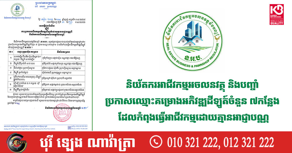 និយ័តករអាជីវកម្មអចលនវត្ថុ និងបញ្ចាំ ប្រកាសឈ្មោះគម្រោងអភិវឌ្ឍដីឡូត៍ចំនួន ៧កន្លែង ដែលកំពុងធ្វើអាជីវកម្មដោយគ្មានអាជ្ញាបណ្ណ
