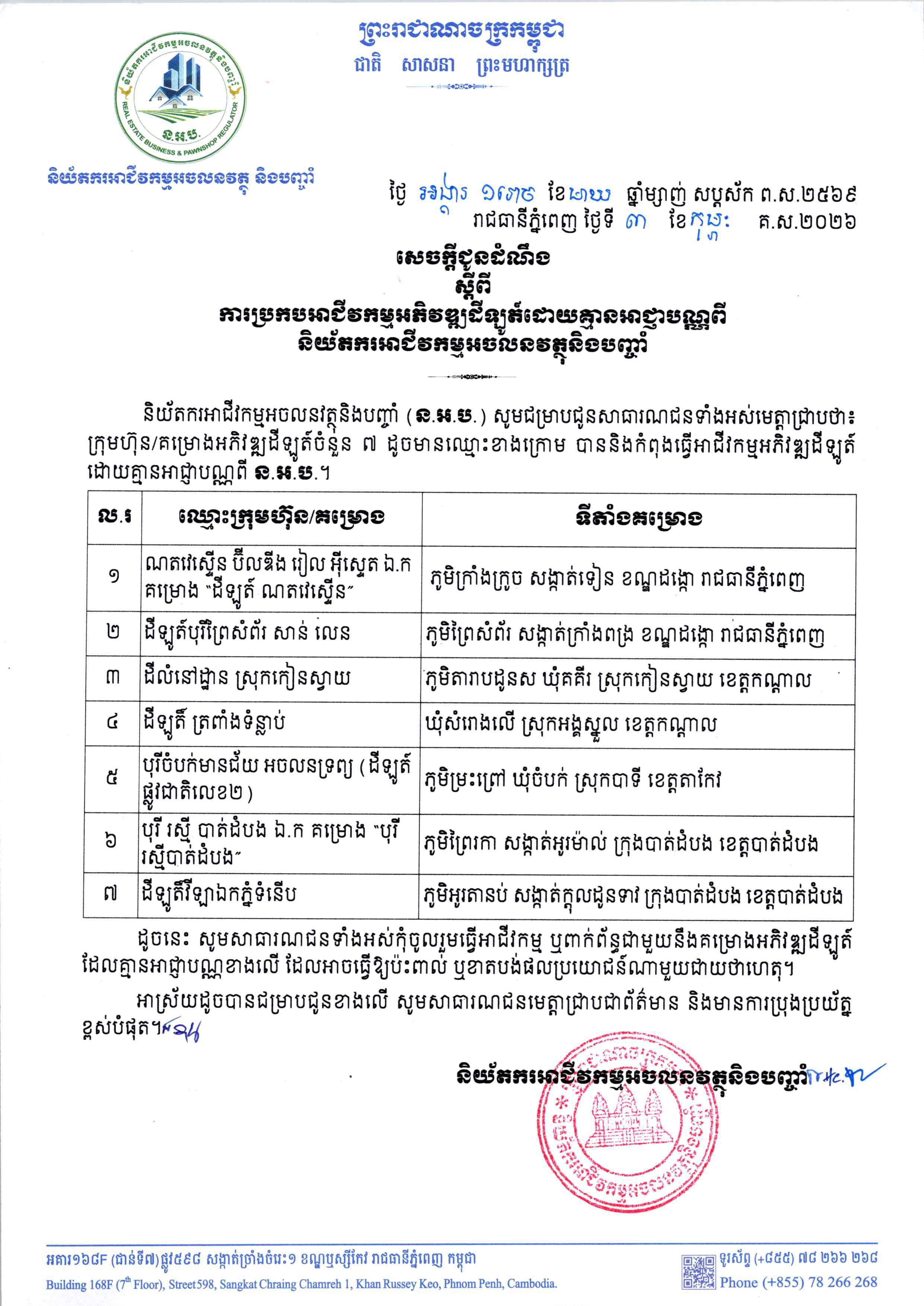 (ភ្នំពេញ)៖ និយ័តករអាជីវកម្មអចលនវត្ថុ និងបញ្ចាំ បានចេញសេចក្តីជូនដំណឹងអំពីគម្រោងអភិវឌ្ឍដីឡូត៍ចំនួន ៧កន្លែង ដែលបាន និងកំពុងធ្វើអាជីវកម្ម ដោយគ្មានអាជ្ញាបណ្ណនិយ័តករអាជីវកម្មអចលនវត្ថុ និងបញ្ចាំ។ នេះបើតាមសេចក្តីជូនដំណឹង ដែលបណ្តាញព័ត៌មាន Fresh News ទទួលបាននៅថ្ងៃទី៥ ខែកុម្ភៈនេះ។
