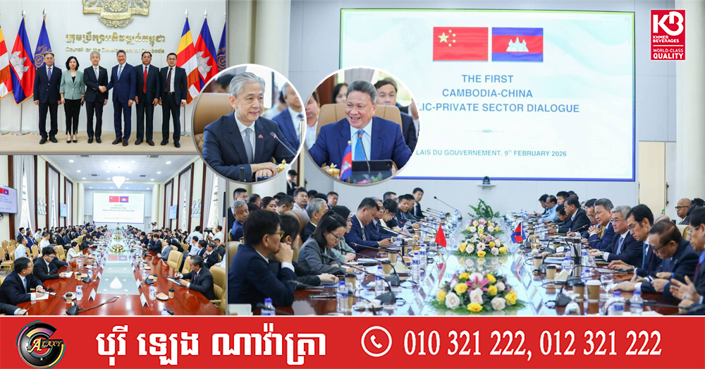 (ភ្នំពេញ)៖ លោក ស៊ុន ចាន់ថុល ឧបនាយករដ្ឋមន្ត្រី អនុប្រធានទី១ ក្រុមប្រឹក្សាអភិវឌ្ឍន៍កម្ពុជា និងលោក Wang Wenbin ឯកអគ្គរដ្ឋទូតនៃសាធារណរដ្ឋប្រជាមានិតចិនប្រចាំកម្ពុជា នាព្រឹកថ្ងៃទី៩ ខែកុម្ភៈ ឆ្នាំ២០២៦នេះ បានដឹកនាំកិច្ចសន្ទនាលើកទី១ រវាងរដ្ឋនិងវិស័យឯកជន កម្ពុជា-ចិន ដោយមានការចូលរួមពីតំណាងក្រុមហ៊ុនចិនចំនួន៨០ មកពីសមាគម សភាពាណិជ្ជកម្មចិននៅកម្ពុជា ថ្នាក់ដឹកនាំតំណាងអន្តរក្រសួងស្ថាប័នជាសមាជិកក្រុមប្រឹក្សាអភិវឌ្ឍន៍កម្ពុជា។