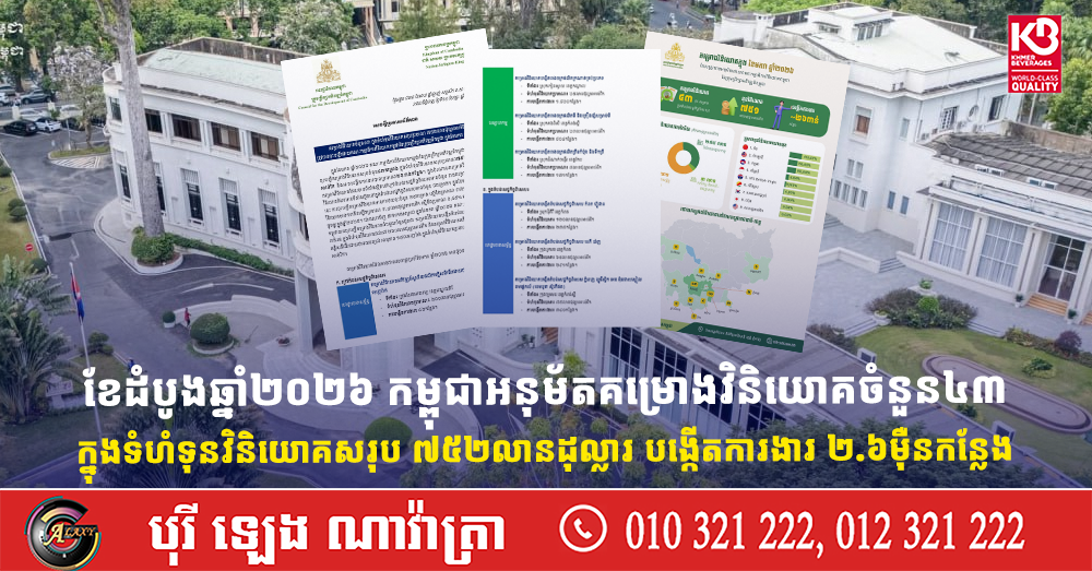 ខែដំបូងឆ្នាំ២០២៦ កម្ពុជាអនុម័តគម្រោងវិនិយោគចំនួន៤៣ ក្នុងទំហំទុនវិនិយោគសរុប ៧៥២លានដុល្លារ បង្កើតការងារ ២.៦ម៉ឺនកន្លែង