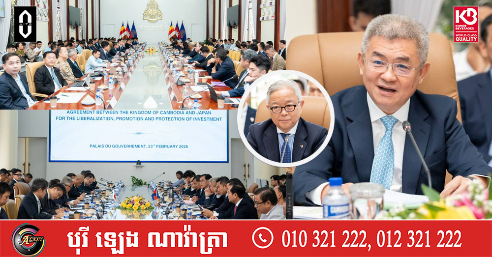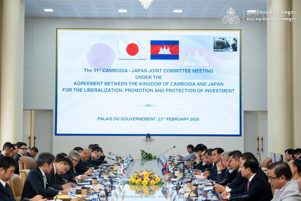 (ភ្នំពេញ)៖ លោក ជា វុទ្ធី អគ្គលេខាធិការគណៈកម្មាធិការវិនិយោគកម្ពុជានៃក្រុមប្រឹក្សាអភិវឌ្ឍន៍កម្ពុជា និងលោក UENO Atsushi ឯកអគ្គរដ្ឋទូតវិសាមញ្ញ និងពេញសមត្ថភាពនៃប្រទេសជប៉ុនប្រចាំកម្ពុជា នាថ្ងៃទី២៣ ខែកុម្ភៈ ឆ្នាំ២០២៦នេះ បានអញ្ជើញធ្វើជាសហប្រធានដឹកនាំកិច្ចប្រជុំលើកទី៣១ នៃគណៈកម្មាធិការចម្រុះកម្ពុជា-ជប៉ុនក្រោមកិច្ចព្រមព្រៀងរវាងកម្ពុជា និងជប៉ុន ស្តីពីសេរីភាវូបនីយកម្ម, ការជំរុញ, និងការការពារវិនិយោគ។