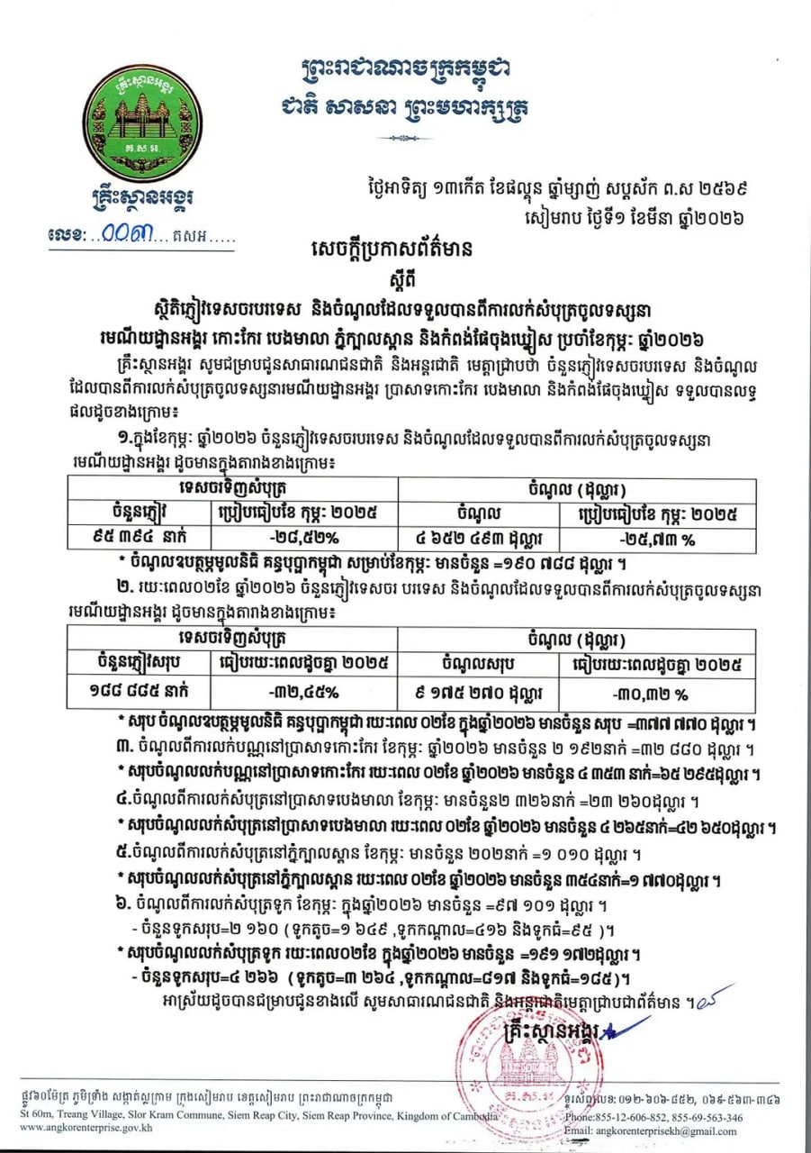 គ្រឹះស្ថានអង្គរបានបញ្ជាក់ថា ក្នុងខែមករា និងខែកុម្ភៈ ឆ្នាំ២០២៦នេះ ចំណូលដែលទទួលបាន ពីការលក់សំបុត្រចូលទស្សនា រមណីយដ្ឋានអង្គរមានចំនួន ៨ ១៧៥ ២៧០ដុល្លារ ថយចុះ៣០.៣២% បើធៀបនឹងខែមករា និងខែកុម្ភៈ ឆ្នាំ២០២៥។ ចំណែកចំនួនភ្ញៀវទេសចរបរទេស មានចំនួន ១៨៨ ៨៨៥នាក់ ថយចុះ៣២.៤៥%។