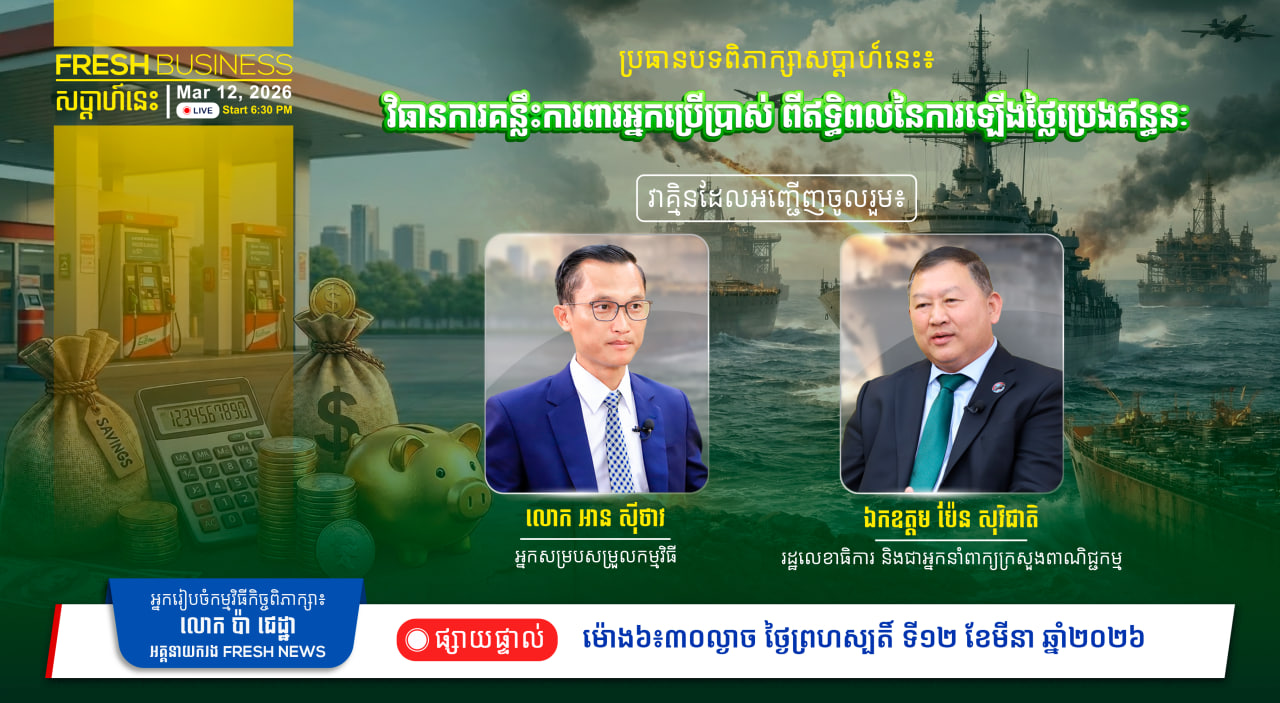 FRESH BUSINESS: កិច្ចពិភាក្សា ស្តីពី «វិធានការគន្លឹះការពារអ្នកប្រើប្រាស់ ពីឥទ្ធិពលនៃការឡើងថ្លៃប្រេងឥន្ធនៈ» សូមរង់ចាំទស្សនា នៅល្ងាចថ្ងៃព្រហស្បតិ៍នេះ