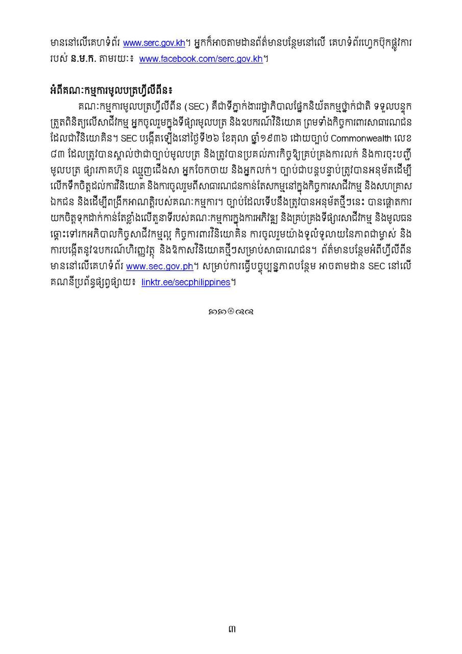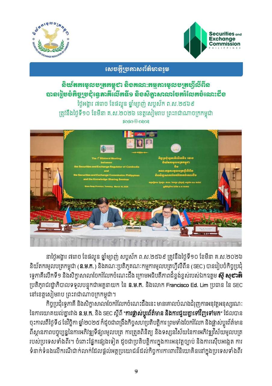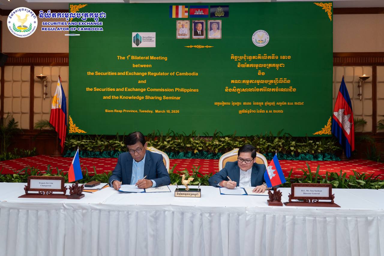 (ភ្នំពេញ)៖ និយ័តករមូលបត្រកម្ពុជា (ន.ម.ក.) និងគណៈប្រតិភូគណៈកម្មការមូលបត្រហ្វីលីពីន (SEC) បានរៀបចំកិច្ចប្រជុំទ្វេភាគីលើកទី១ និងសិក្ខាសាលាចែករំលែកចំណេះដឹង ក្រោមអធិបតីភាពលោក ស៊ូ សុជាតិ ប្រតិភូរាជរដ្ឋាភិបាលទទួលបន្ទុកជាអគ្គនាយក នៃ ន.ម.ក. និងលោក Francisco Ed. Lim ប្រធាន នៃ SEC នៅខេត្តសៀមរាប នាថ្ងៃទី១០ ខែមីនា ឆ្នាំ២០២៦។