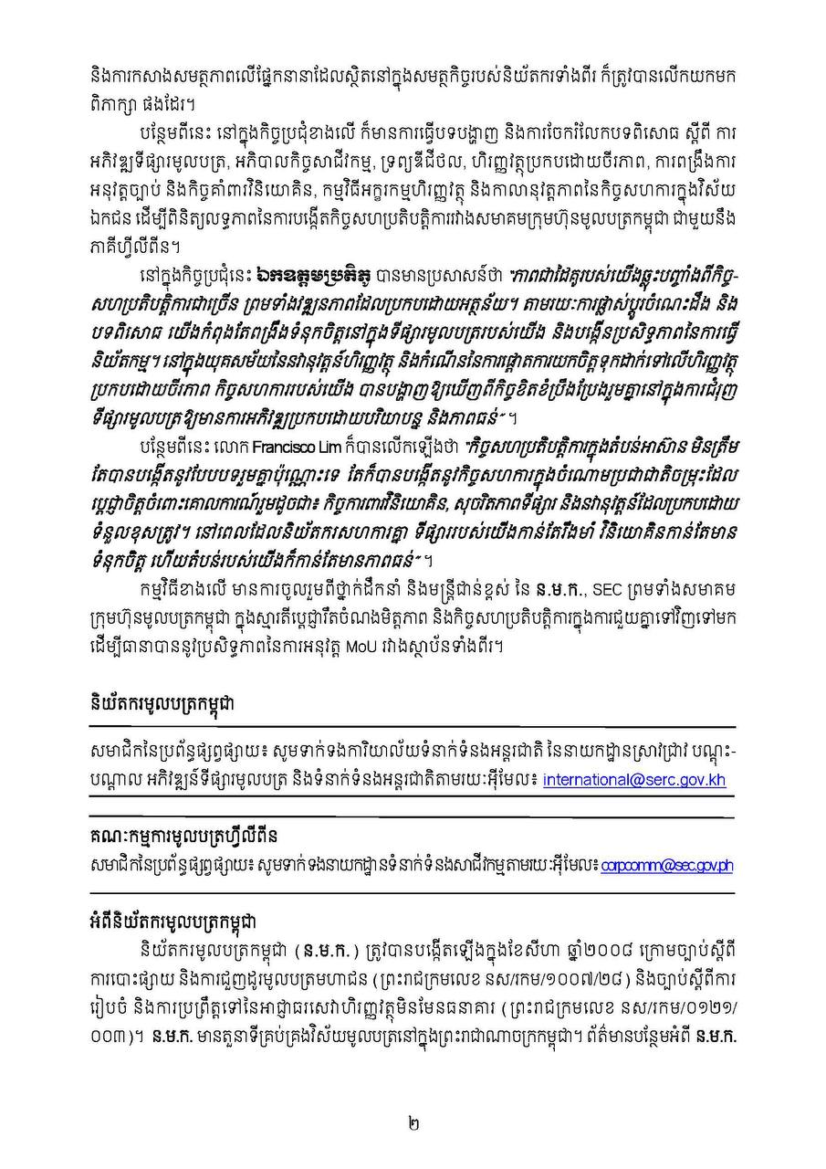នៅក្នុងកិច្ចប្រជុំនេះ លោកប្រតិភូ បានថ្លែងថា «ភាពជាដៃគូរបស់យើងឆ្លុះបញ្ចាំងពីកិច្ច-សហប្រតិបត្តិការជាច្រើន ព្រមទាំងវឌ្ឍនភាពដែលប្រកបដោយអត្ថន័យ។ តាមរយៈការផ្លាស់ប្តូរចំណេះដឹង និងបទពិសោធ យើងកំពុងតែពង្រឹងទំនុកចិត្តនៅក្នុងទីផ្សារមូលបត្ររបស់យើង និងបង្កើនប្រសិទ្ធភាពនៃការធ្វើនិយ័តកម្ម»។