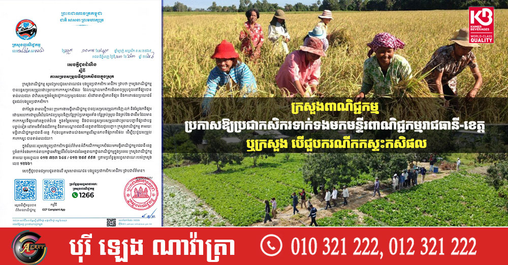 (ភ្នំពេញ)៖ ក្រសួងពាណិជ្ជកម្ម នៅថ្ងៃទី១៣ ខែមីនា ឆ្នាំ២០២៦នេះ បានចេញសេចក្តីជូនដំណឹងថ្មីមួយ ដោយប្រកាសឱ្យប្រជាកសិករទាក់ទង មកមន្ទីរពាណិជ្ជកម្មរាជធានី-ខេត្ត ឬទាក់ទងមកក្រសួង បើជួបករណីកកស្ទះកសិផល។