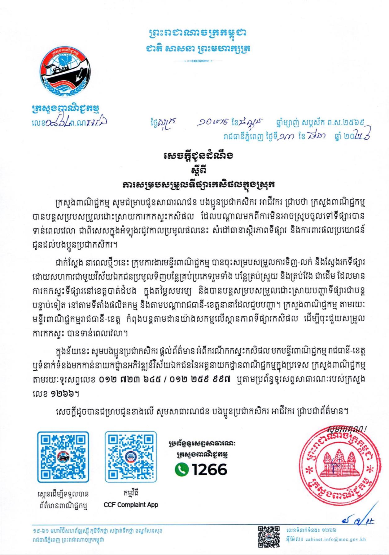 ក្រសួងពាណិជ្ជកម្ម ប្រកាសឱ្យប្រជាកសិករទាក់ទងមកមន្ទីរពាណិជ្ជកម្មរាជធានី-ខេត្ត ឬក្រសួង បើជួបករណីកកស្ទះកសិផល