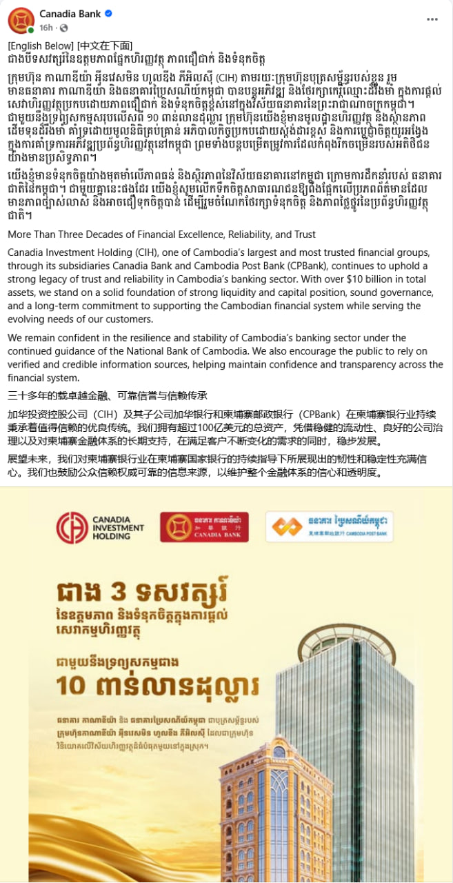 សូមជម្រាបថា តាមរយៈសេចក្តីថ្លែងការណ៍របស់ខ្លួន នៅក្នុងវីដេអូឃ្លឹបជាង៥នាទី លោកស្រី ជា សិរី ទេសាភិបាលធនាគារជាតិនៃកម្ពុជា នៅថ្ងៃទី១៧ ខែមីនា ឆ្នាំ២០២៦ បានបញ្ជាក់ថា ប្រព័ន្ធធនាគារទាំងអស់នៅកម្ពុជានៅមានភាពរឹងមាំល្អ ហើយស្នើសុំឲ្យបងប្អូនកុំសម្រុកដកសាច់ប្រាក់ ដើម្បីទុកពេលវេលាឲ្យធនាគារជាតិកម្ពុជា ធ្វើកិច្ចការលើបញ្ហានេះជាមួយធនាគារពាក់ព័ន្ធ។