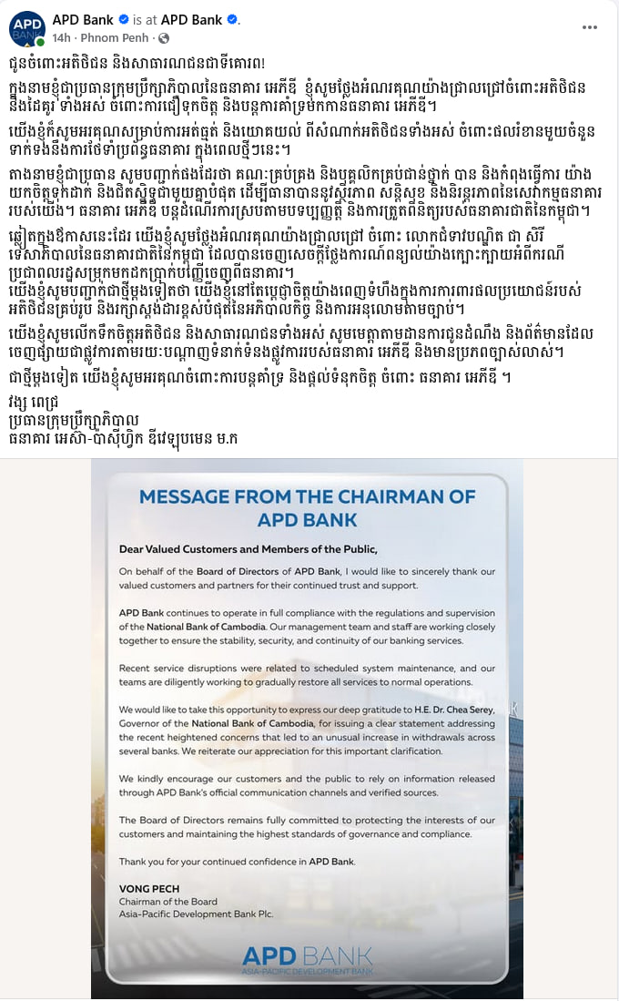 ធនាគារ APD បានអះអាងថា ខ្លួនបន្តដំណើរការស្របតាមបទប្បញ្ញត្តិ និងការត្រួតពិនិត្យរបស់ធនាគារជាតិនៃកម្ពុជា ហើយថាខ្លួនបាន និងកំពុងធ្វើការយ៉ាងយកចិត្តទុកដាក់ និងជិតស្និទ្ធជាមួយគ្នាបំផុត ដើម្បីធានាបាននូវស្ថិរភាព សន្តិសុខ និងនិរន្តរភាពនៃសេវាកម្មធនាគារ។ ធនាគារ APD បានអរគុណដល់អតិថិជនរបស់ខ្លួន ដែលបានអត់ធ្មត់ និងយោគយល់ ពោះផលរំខានមួយចំនួនទាក់ទងនឹងការថែទាំប្រព័ន្ធធនាគារ ក្នុងពេលថ្មីៗនេះ។