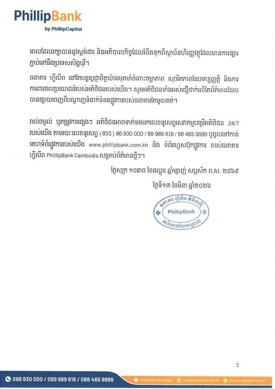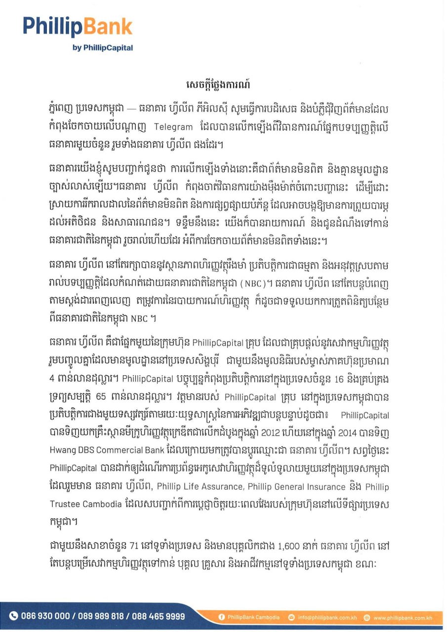 ធនាគារ ហ្វីលីព អះអាងថា ខ្លួននៅតែរក្សាបាននូវស្ថានភាពហិរញ្ញវត្ថុរឹងមាំ ប្រតិបត្តិការជាធម្មតា និងអនុវត្តស្របតាម រាល់បទប្បញ្ញត្តិ ដែលកំណត់ដោយធនាគារជាតិនៃកម្ពុជា (NBC)។ ធនាគារ ហ្វីលីព គឺជាផ្នែកមួយនៃក្រុមហ៊ុន PhillipCapital គ្រុប ដែលជាគ្រុបផ្តល់នូវសេវាកម្មហិរញ្ញវត្ថុ រួមបញ្ចូលគ្នាដែលមានមូលដ្ឋាននៅប្រទេសសិង្ហបុរី ជាមួយនឹងមូលនិធិរបស់ម្ចាស់ភាគហ៊ុនប្រមាណ ៤ពាន់លានដុល្លារ។ PhillipCapital បច្ចុប្បន្នកំពុងប្រតិបត្តិការនៅក្នុងប្រទេសចំនួន ១៦ និងគ្រប់គ្រងទ្រព្យសម្បត្តិ ៦៥ពាន់លានដុល្លារ។