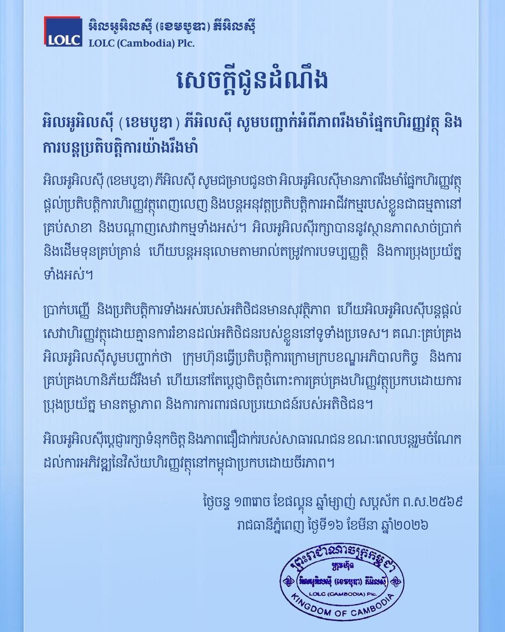 សម្រាប់ អិលអូអិលស៊ី (ខេមបូឌា) ភីអិលស៊ី បានបញ្ជាក់អំពីភាពរឹងមាំផ្នែកហិរញ្ញវត្ថុ និងការបន្តប្រតិបត្តិការយ៉ាងរឹងមាំ និងអះអាងពីការរក្សាបាននូវស្ថានភាពសាច់ប្រាក់ និងដើមទុនគ្រប់គ្រាន់ ហើយបន្តអនុលោមតាមរាល់តម្រូវការបទប្បញ្ញត្តិ និងការប្រុងប្រយ័ត្ន ទាំងអស់។