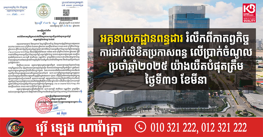 អគ្គនាយកដ្ឋានពន្ធដារ រំលឹកពីកាតព្វកិច្ច ការដាក់លិខិតប្រកាសពន្ធ លើប្រាក់ចំណូលប្រចាំឆ្នាំ២០២៥ យ៉ាងយឺតបំផុតត្រឹមថ្ងៃទី៣១ ខែមីនា (Video inside)