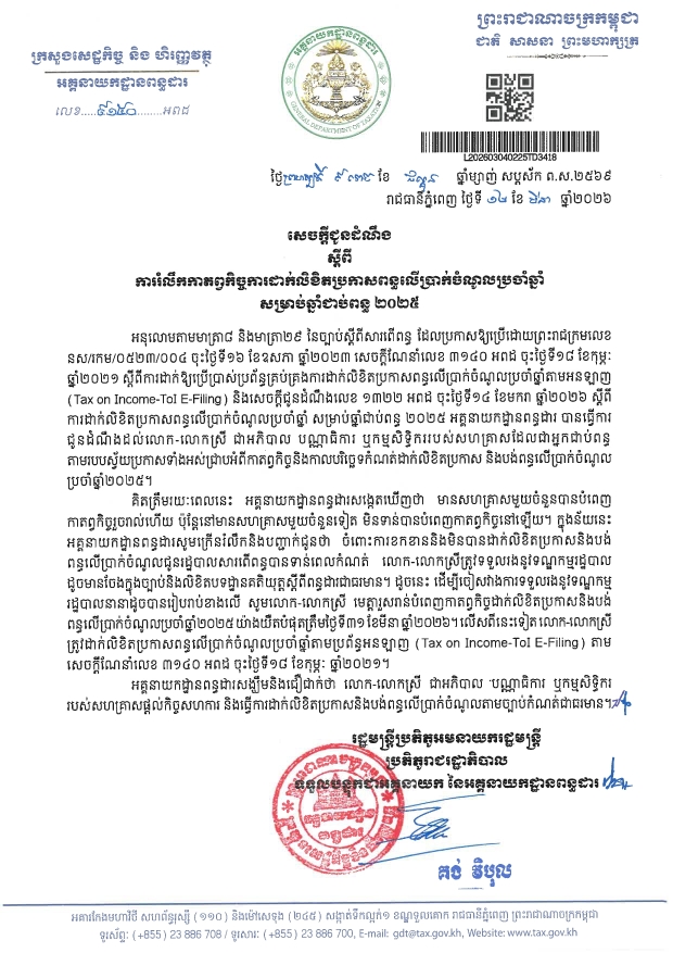 (ភ្នំពេញ)៖ អគ្គនាយកដ្ឋានពន្ធដារ បានចេញសេចក្តីជូនដំណឹង ស្តីពី ការរំលឹកកាតព្វកិច្ច ការដាក់លិខិត ប្រកាសពន្ធ លើប្រាក់ចំណូលប្រចាំឆ្នាំ សម្រាប់ឆ្នាំជាប់ពន្ធ២០២៥ យ៉ាងយឺតបំផុតត្រឹមថ្ងៃទី៣១ ខែមីនា ឆ្នាំ២០២៦ ដើម្បីចៀសវាងការទទួលរងនូវទណ្ឌកម្មរដ្ឋបាលនានា។