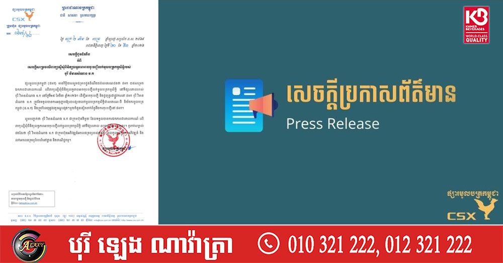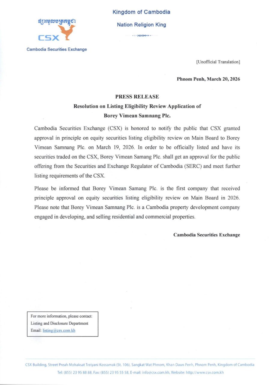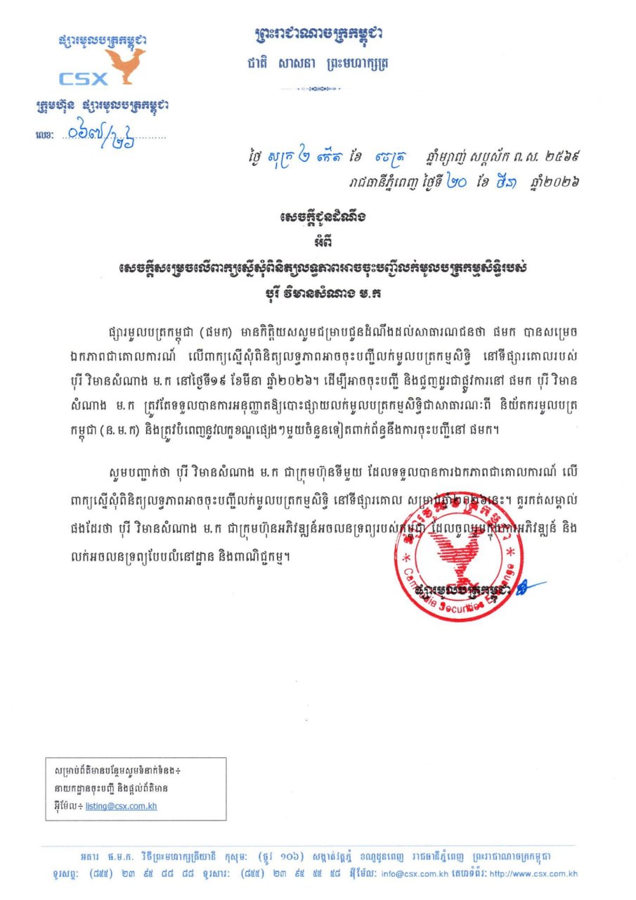 (ភ្នំពេញ)៖ ក្រុមហ៊ុនផ្សារមូលបត្រកម្ពុជា នៅថ្ងៃទី២០ ខែមីនា ឆ្នាំ២០២៦នេះ បានចេញសេចក្តីប្រកាសព័ត៌មាន បញ្ជាក់ពីការសម្រេច ឯកភាពជាគោលការណ៍ លើពាក្យស្នើសុំពិនិត្យលទ្ធភាពអាចចុះបញ្ជីលក់មូលបត្រកម្មសិទ្ធិ (ភាគហ៊ុន) នៅទីផ្សារគោលរបស់បុរី វិមានសំណាង ម.ក។
