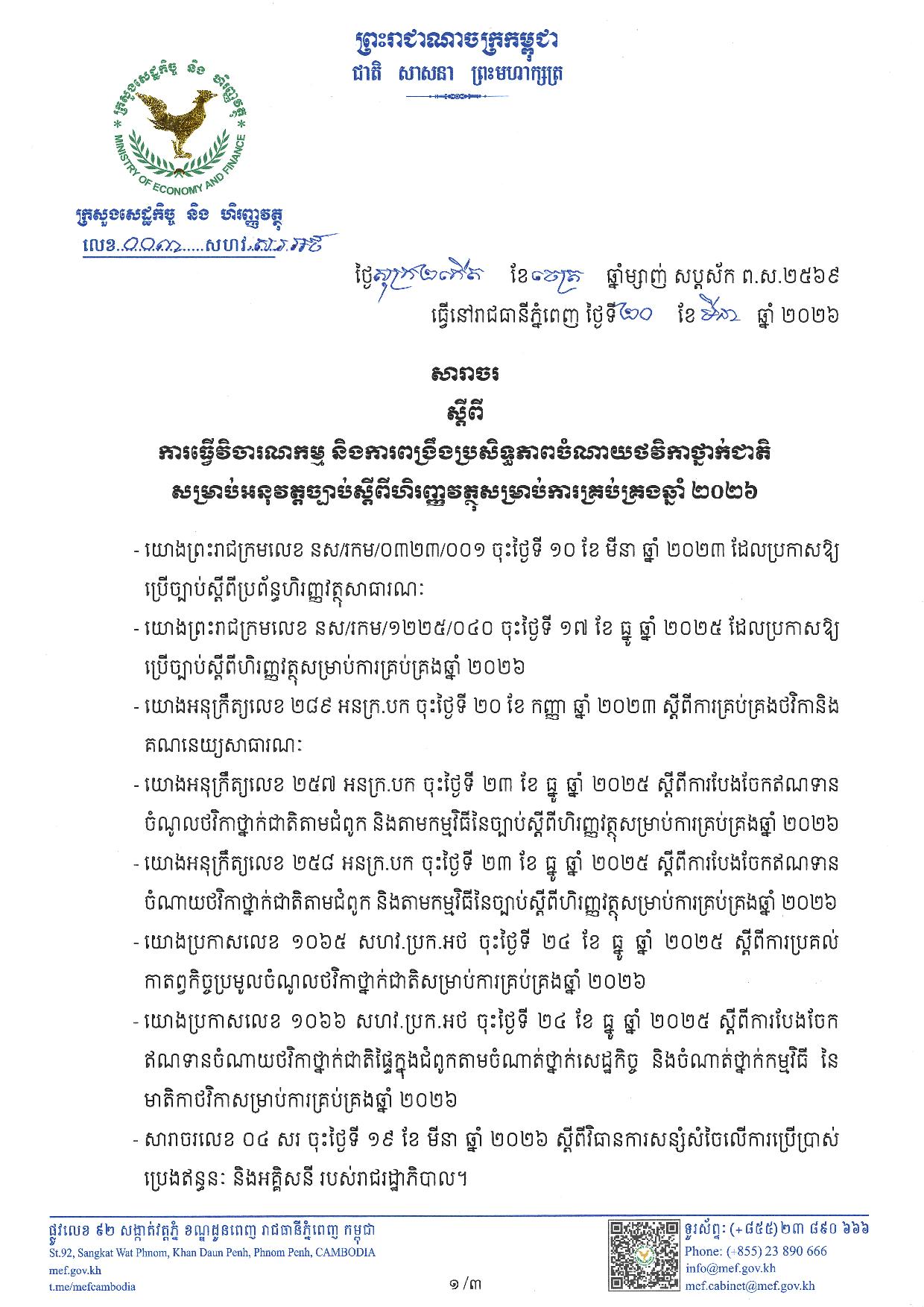 (ភ្នំពេញ)៖ ក្រសួងសេដ្ឋកិច្ច និងហិរញ្ញវត្ថុ បានចេញសារាចរ ស្ដីពី ការធ្វើវិចារណកម្ម និងការពង្រឹងប្រសិទ្ធភាពចំណាយថវិកាថ្នាក់ជាតិ សម្រាប់អនុវត្ដច្បាប់ ស្ដីពី ហិរញ្ញវត្ថុសម្រាប់ការគ្រប់គ្រងឆ្នាំ២០២៦។