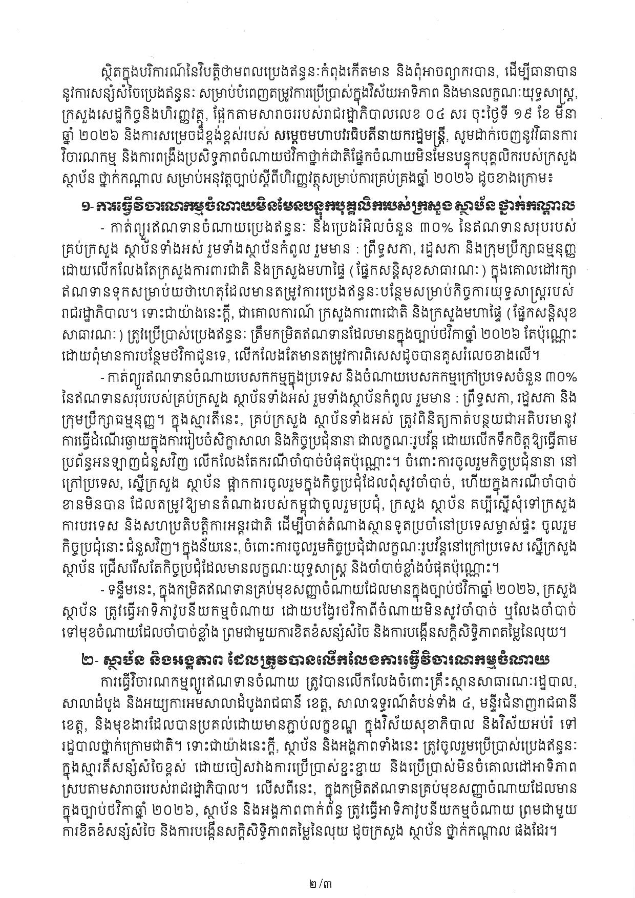 ក្នុងសារាចរ បានបញ្ជាក់ថា កាត់ព្យួរឥណទានចំណាយបេសកកម្មក្នុងប្រទេស និងចំណាយបេសកកម្មក្រៅប្រទេសចំនួន៣០% នៃឥណទានសរុបរបស់គ្រប់ក្រសួង ស្ថាប័នទាំងអស់ រួមទាំងស្ថាប័នកំពូល រួមមាន៖ ព្រឹទ្ធសភា, រដ្ឋសភា និង ក្រុមប្រឹក្សាធម្មនុញ្ញ។