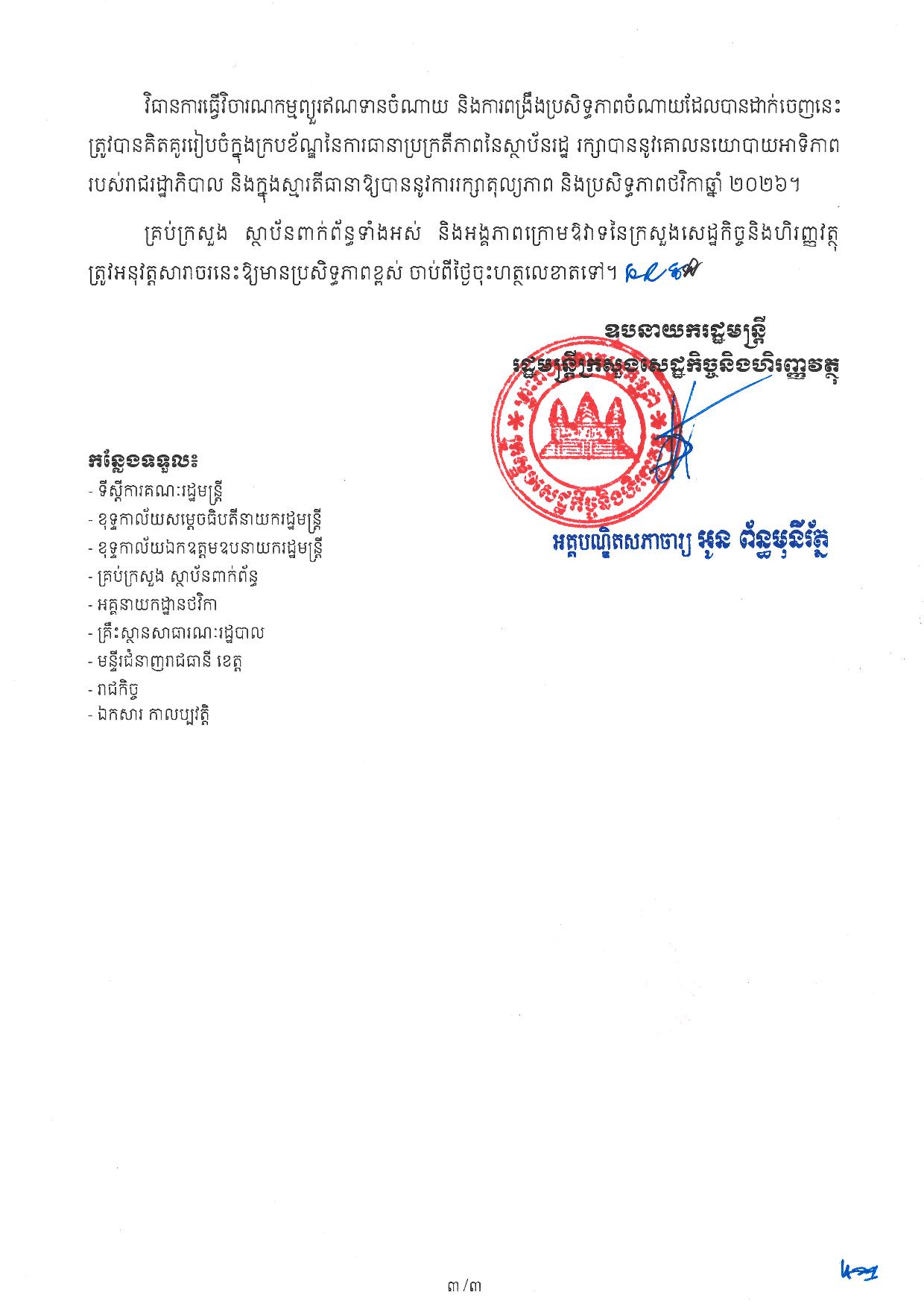 (ភ្នំពេញ)៖ ក្រសួងសេដ្ឋកិច្ច និងហិរញ្ញវត្ថុ បានចេញសារាចរ ស្ដីពី ការធ្វើវិចារណកម្ម និងការពង្រឹងប្រសិទ្ធភាពចំណាយថវិកាថ្នាក់ជាតិ សម្រាប់អនុវត្ដច្បាប់ ស្ដីពី ហិរញ្ញវត្ថុសម្រាប់ការគ្រប់គ្រងឆ្នាំ២០២៦ ដោយបានលើកទឹកចិត្តដល់គ្រប់ក្រសួង-ស្ថាប័ន រៀបចំសិក្ខាសាលា និងកិច្ចប្រជុំ តាមប្រព័ន្ធអនឡាញ។