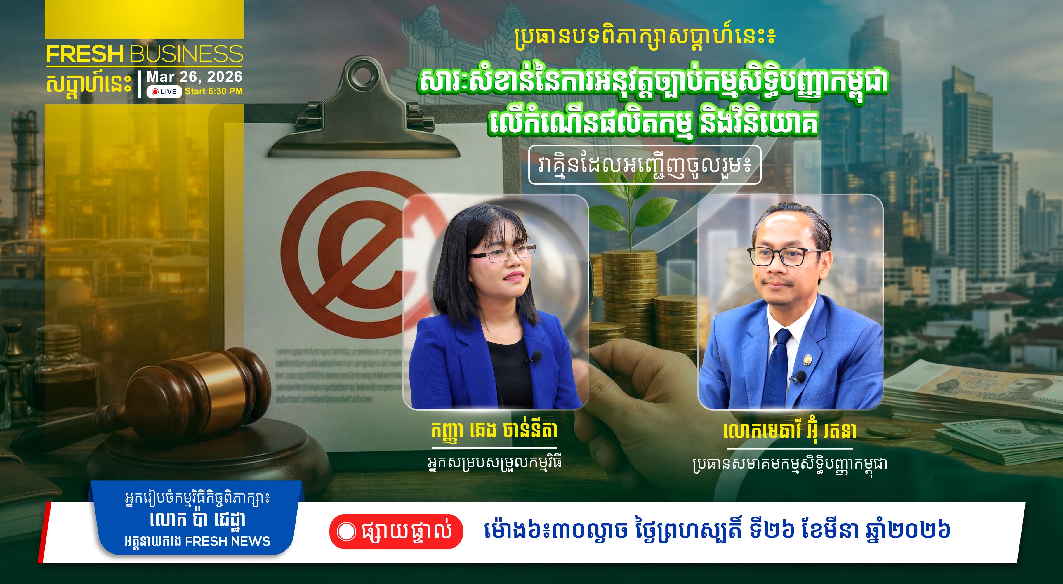 FRESH BUSINESS: កិច្ចពិភាក្សា ស្តីពី «សារៈសំខាន់នៃការអនុវត្តច្បាប់កម្មសិទ្ធិបញ្ញា លើកំណើនផលិតកម្ម និងវិនិយោគនៅកម្ពុជា» សូមរង់ចាំទស្សនា នៅល្ងាចថ្ងៃព្រហស្បតិ៍នេះ