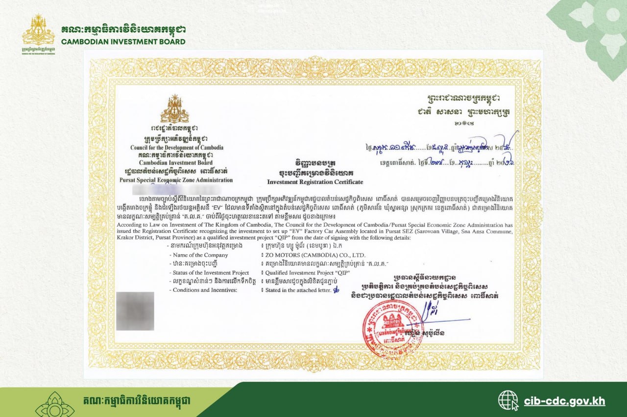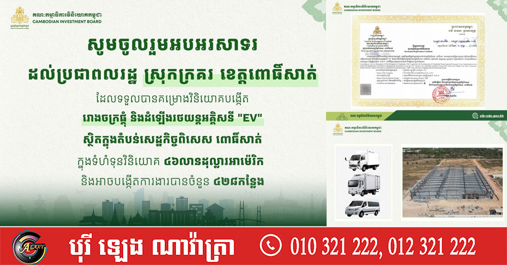 (ភ្នំពេញ)៖ គណៈកម្មាធិការវិនិយោគកម្ពុជា នៃក្រុមប្រឹក្សាអភិវឌ្ឍន៍កម្ពុជា បានចុះបញ្ជីជាផ្លូវការ លើគម្រោងវិនិយោគបង្កើតរោងចក្របង្គុំ និងដំឡើងរថយន្តពាណិជ្ជកម្មអគ្គិសនីខ្នាតធំដំបូងគេបង្អស់ នៅខេត្តពោធិ៍សាត់ ក្រោមទុនវិនិយោគជិត៥០លានដុល្លារអាមេរិក។