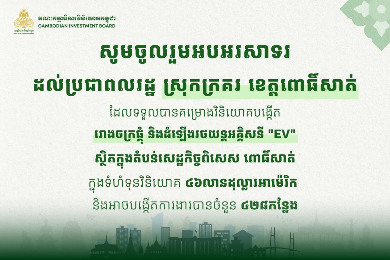 គណៈកម្មាធិការវិនិយោគកម្ពុជា បានផ្សព្វផ្សាយលើបណ្តាញទំនាក់ទំនងសង្គមផ្លូវការរបស់ខ្លួនថា «សូមចូលរួមអបអរសាទរ ដល់ប្រជាពលរដ្ឋស្រុកក្រគរ ខេត្តពោធិ៍សាត់ ដែលទទួលបានគម្រោងវិនិយោគបង្កើតរោងចក្រផ្គុំ និងដំឡើងរថយន្តអគ្គិសនី EVស្ថិតក្នុងតំបន់សេដ្ឋកិច្ចពិសេស ពោធិ៍សាត់ ក្នុងទំហំទុនវិនិយោគ ៤៦លានដុល្លារអាម៉េរិក និងអាចបង្កើតការងារបានចំនួន ៤២៨កន្លែង»។