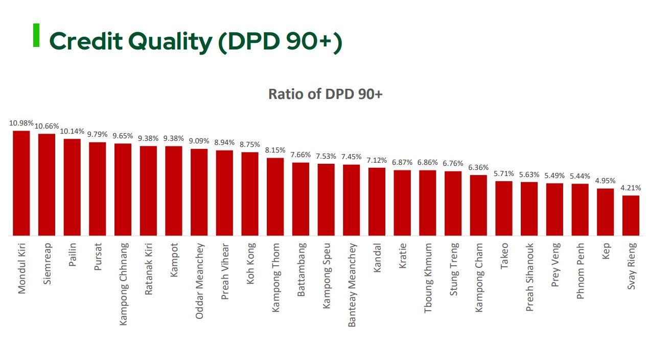 យោងតាមរបាយការណ៍របស់ CBC ខេត្តដែលជួបប្រទះការសងត្រឡប់យឺតជាង ៩០ថ្ងៃច្រើនជាងគេ គឺខេត្តមណ្ឌលគិរី មានអត្រា១០.៩៨% បន្ទាប់មកខេត្តសៀមរាប ស្ថិតក្នុងអត្រា ១០.៦៦% ខណៈប៉ៃលិនស្ថិតនៅលំដាប់ទី៣ ស្ថិតក្នុងអត្រា ១០.១៤%។ ចំណែករាជធានីភ្នំពេញ ដែលមានឥណទានខ្ពស់ជាង គឺគុណភាពឥណទាននៅតែល្អប្រសើរ ក្នុងអត្រា ៥.៤៤% ហើយខេត្តដែលជួបប្រទះការសងត្រឡប់យឺតជាង៩០ថ្ងៃ ទាបជាងគឺស្វាយរៀង មានអត្រា ៤.២១% ។