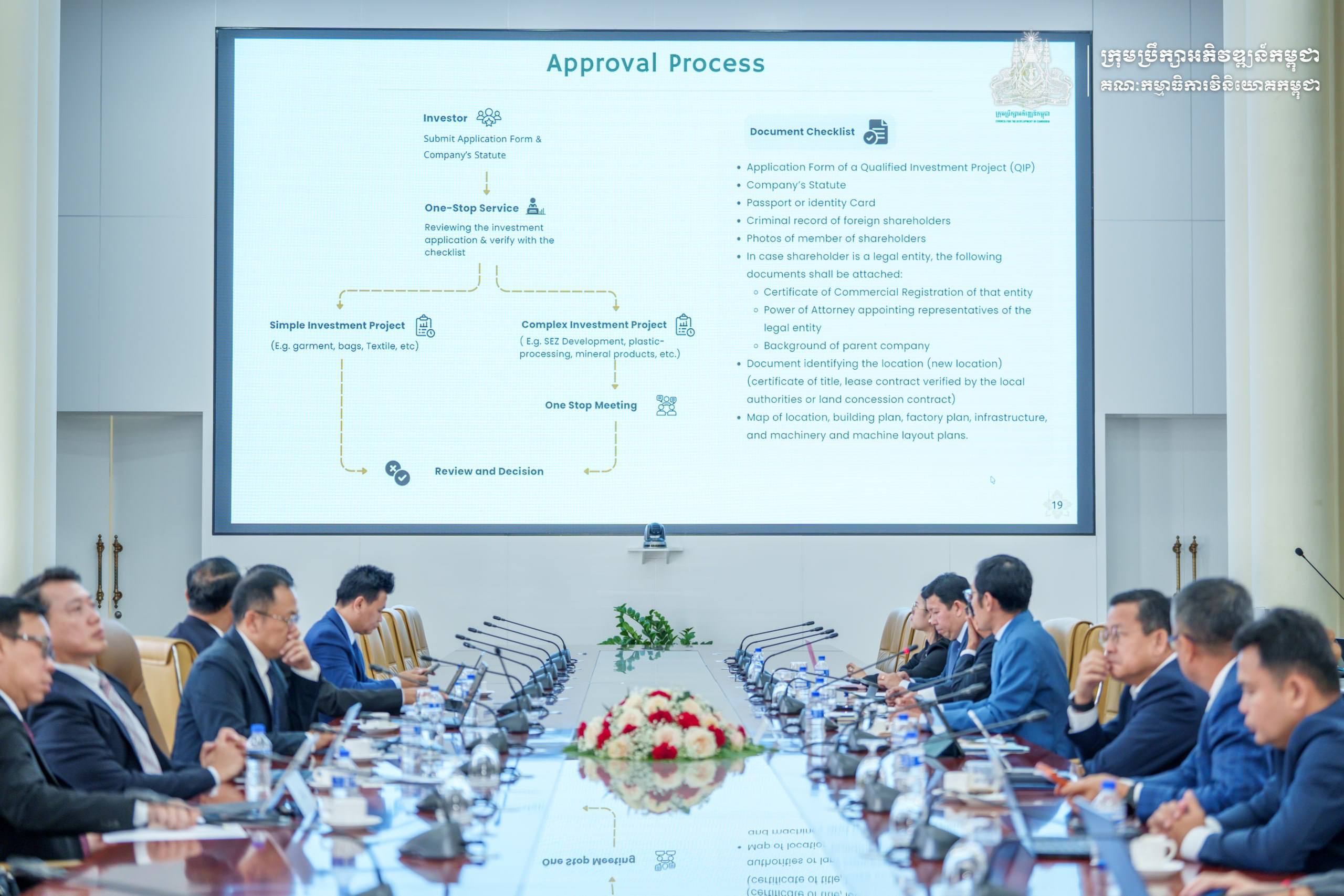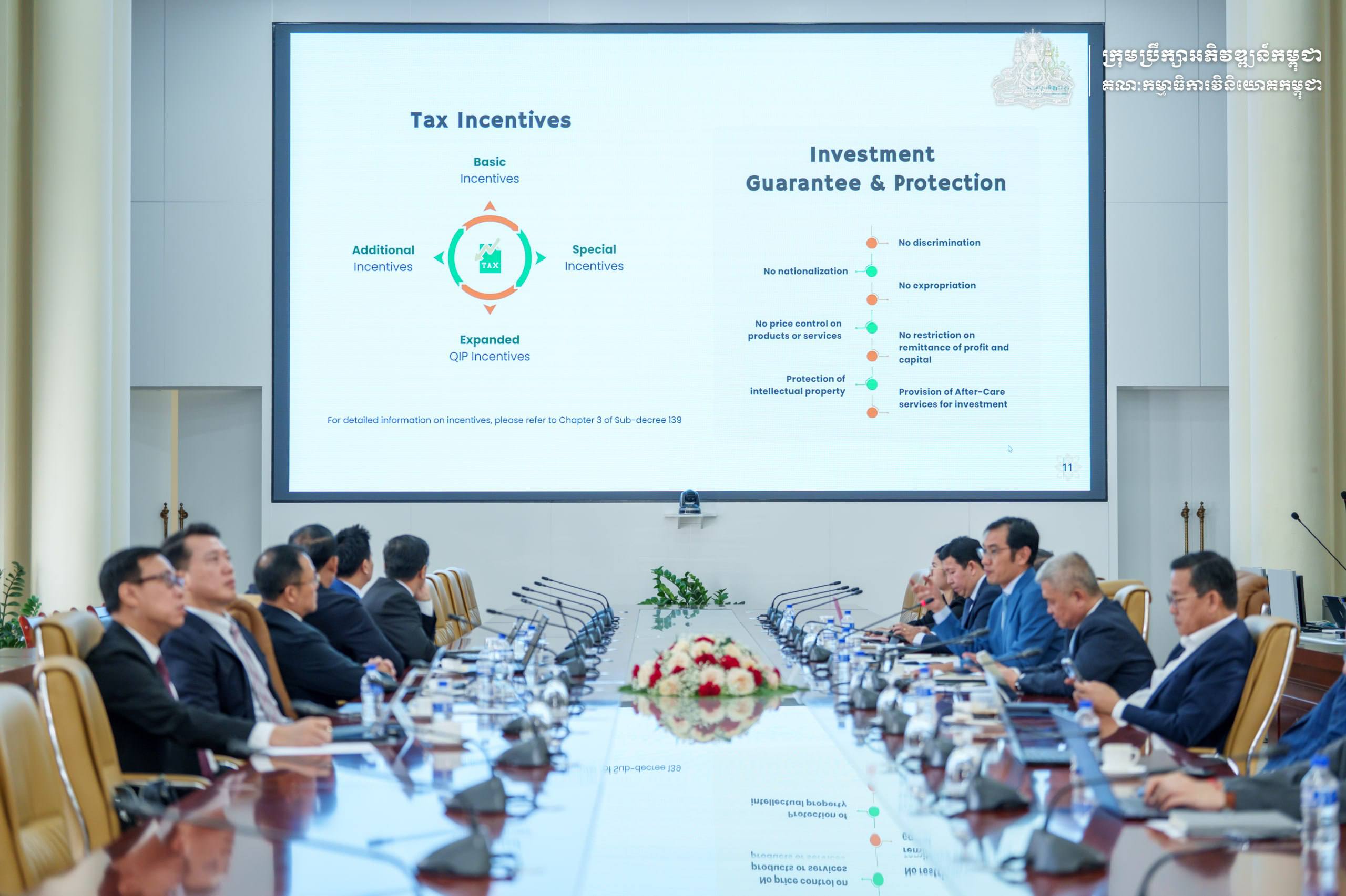 បន្ថែមពីនេះ លោក លឹម វិសាល អគ្គលេខាធិការរង គ.វ.ក. បានធ្វើបទបង្ហាញស្តីពីច្បាប់ស្តីពីវិនិយោគ, របបនៃការលើកទឹកចិត្តវិនិយោគ និងនីតិវិធីនៃការចុះបញ្ជីគម្រោងវិនិយោគ។ ទន្ទឹមគ្នានេះលោក សួន សុផល អគ្គលេខាធិការរង គ.វ.ក. ថែមទាំងបានធ្វើបទបង្ហាញស្តីពីដំណើរការនៃការរៀបចំកិច្ចសន្ទនារវាងរដ្ឋ និងផ្នែកឯកជននៃបណ្តាប្រទេសមួយចំនួន ដើម្បីសម្របសម្រួលដោះស្រាយបញ្ហាប្រឈមរបស់វិនិយោគិន ដែលកិច្ចការនេះជាផ្នែកដ៏សំខាន់មួយក្នុងការថែទាំ