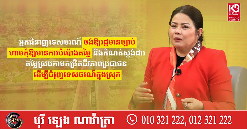 (ភ្នំពេញ)៖ ថ្លែងក្នុងកម្មវិធី FRESH BUSINESS ដែលពិភាក្សាលើប្រធានបទ «មូលដ្ឋានជំរុញអភិវឌ្ឍវិស័យទេសចរណ៍ក្នុងស្រុក» ឧកញ៉ា ស្រ៊ៀត មុំសុភា អនុប្រធានសមាគមទេសចរណ៍កម្ពុជា ក្នុងនាមជាអ្នកជំនាញទេសចរណ៍ ចង់ឱ្យរាជរដ្ឋាភិបាលបង្កើតច្បាប់ហាមកុំឱ្យមានការបំប៉ោងតម្លៃ និងកំណត់ស្តង់ដារតម្លៃស្របតាមកម្រិតជីវភាពប្រជាជន ដើម្បីជំរុញទេសចរណ៍ក្នុងស្រុក។