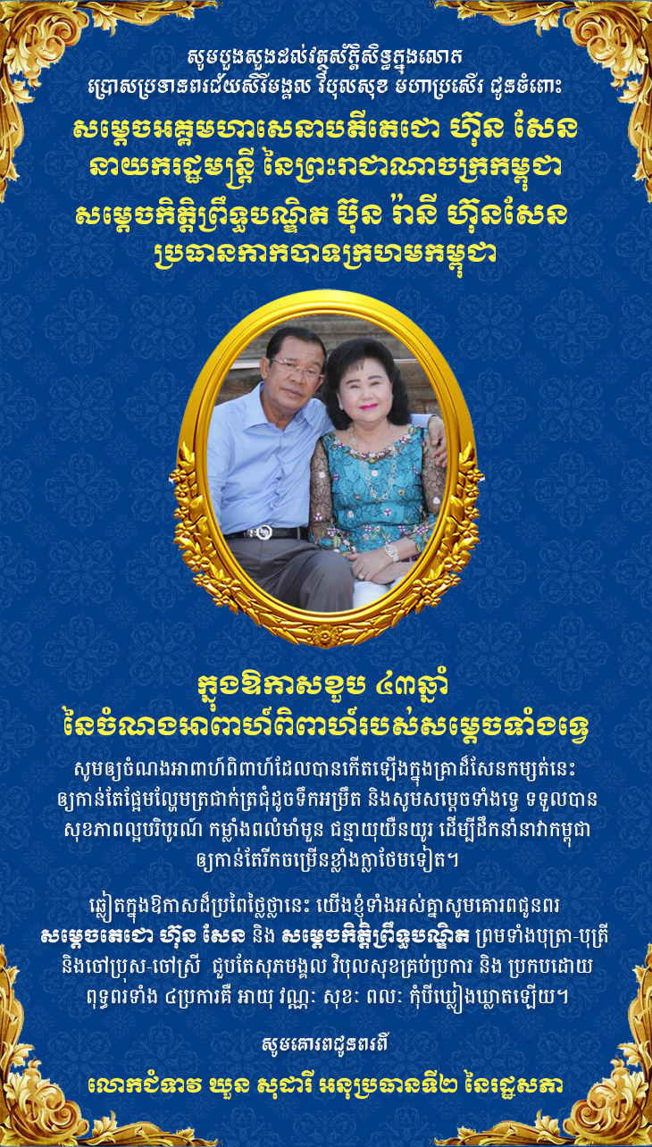 (ភ្នំពេញ)៖ ឆ្លៀតក្នុងឱកាសដ៏ប្រពៃថ្លៃថ្លានៃ ខួប៤៣ឆ្នាំ ចំណងអាពាហ៍ពិពាហ៍របស់ សម្តេចតេជោ ហ៊ុន សែន នាយករដ្ឋមន្ត្រីនៃកម្ពុជា និងសម្តេចកិត្តិព្រឹទ្ធបណ្ឌិត ប៊ុន រ៉ានី ហ៊ុនសែន ប្រធានកាកបាទក្រហមកម្ពុជា, លោកជំទាវ ឃួន សុដារី អនុប្រធានទី២ នៃរដ្ឋសភា សូមបួងសួងដល់ទេវតា និងវត្ថុស័ក្តសិទ្ធលើលោក សូមប្រសិទ្ធពរជ័យឲ្យចំណងអាពាហ៍ពិពាហ៍ដែលបានកើតឡើង ក្នុងគ្រាដ៏សែនកម្សត់នេះឲ្យកាន់តែផ្អែមល្ហែមត្រជាក់ត្រជុំដូចទឹកអម្រឹត និង ទទួលបានសុខភាពល្អបរិបូរណ៍ កម្លាំងពលាំងមាំមួន ជន្មាយុយឺនយូរ ដើម្បីដឹកនាំនាវាកម្ពុជាឲ្យកាន់តែរីកចម្រើនខ្លាំងក្លាថែមទៀត។