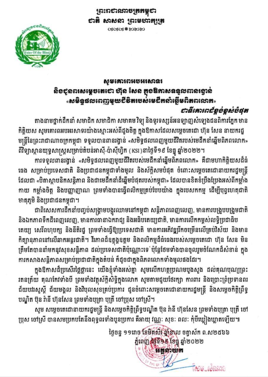 (ភ្នំពេញ)៖ លោក សែម សំណាង ព្រមទាំងថ្នាក់ដឹកនាំ សមាជិក សមាជិកា សមាគមវិទ្យុ និងទូរទស្សន៍អនឡាញសំឡេងជនពិការភ្នែកធា សូមគោរពអបអរសាទរយ៉ាងស្មោះអស់ពីដួងចិត្ត ក្នុងឱកាសដែលសម្តេចតេជោ ហ៊ុន សែន នាយករដ្ឋមន្ត្រីកម្ពុជា ទទួលបានពានរង្វាន់ «សមិទ្ធផលពេញមួយជីវិតរបស់មេដឹកនាំឆ្នើមពិភពលោក» ពីវិទ្យាស្ថានយុទ្ធសាស្ត្រសម្រាប់តំបន់អាស៊ី-ប៉ាស៊ីហ្វិក (KSI)។