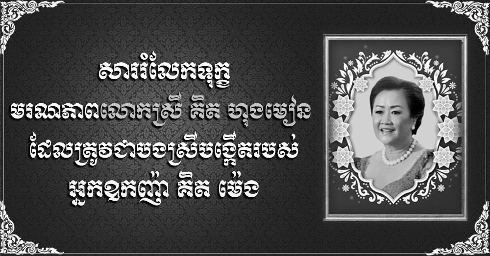 នៅក្នុងវេលាប្រកបដោយក្តីខ្សឹកខ្សួលរំជួលចិត្ត ក្រៀមក្រំស្ទើររកទីបំផុតគ្មាននេះ យើងខ្ញុំសូមចូលរួមរំលែកទុក្ខដ៏ក្រៀមក្រំ ដោយសេចក្តីសោកសង្រេងជាទីបំផុតជាមួយអ្នកឧកញ៉ា និងលោកជំទាវ ព្រមទាំងក្រុមគ្រួសារនៃសព និងសូមសម្តែងនូវការគោរព ចំពោះដួងវិញ្ញាណក្ខន្ធរបស់លោកស្រី គិត ហុងមៀន បានទៅកាន់សុគតិភពកុំបីឃ្លៀងឃ្លាតឡើយ៕