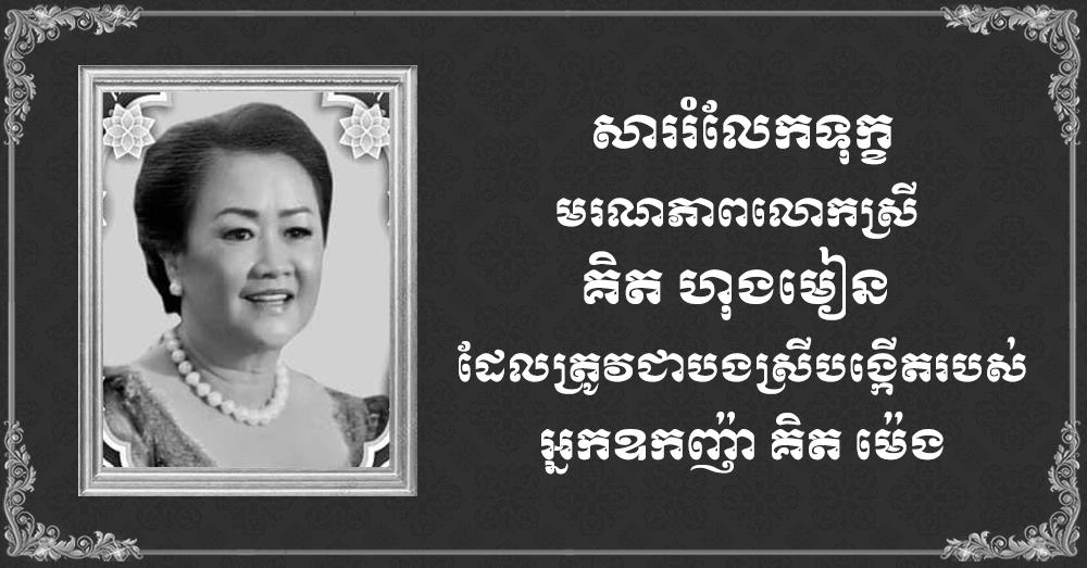 ខ្ញុំ និងភរិយា សូមឧទ្ទិសបួងសួងដល់ដួងវិញ្ញាណក្ខន្ធលោកស្រី គិត ហុងមៀន សូមឆាប់បានចាប់កំណើតកើត ក្នុងសុគតិភពកុំបីឃ្លៀងឃ្លាតឡើយ។ សូម អ្នកឧកញ៉ា ព្រមទាំងក្រុមគ្រួសារ ទទួលនូវមនោសញ្ចេតនារំលែកទុក្ខដ៏ក្រៀមក្រំ ពីខ្ញុំនិងភរិយា»៕