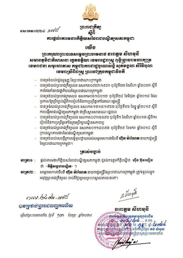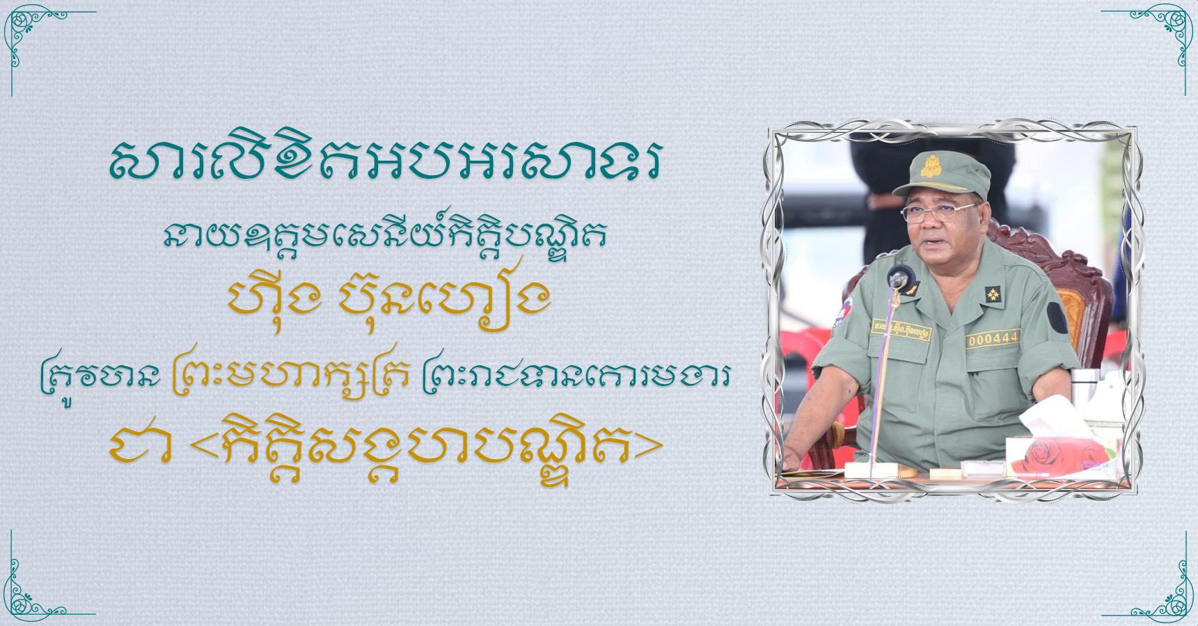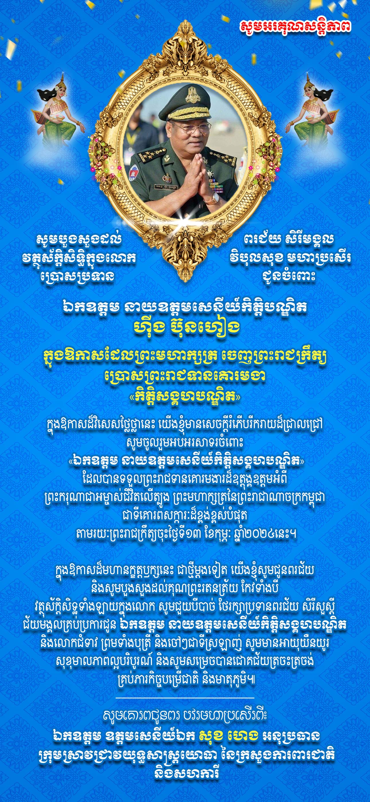 ក្នុងឱកាសដ៏វិសេសថ្លៃថ្លានេះ យើងខ្ញុំមានសេចក្តីរំភើបរីករាយដ៏ជ្រាលជ្រៅ សូមចូលរួមអបអរសាទរចំពោះ «ឯកឧត្តម នាយឧត្តមសេនីយ៍កិត្តិសង្គហបណ្ឌិត» ដែលបានទទួលព្រះរាជទានគោរមងារដ៏ឧត្តុង្គឧត្តមអំពី ព្រះករុណាជាអម្ចាស់ជីវិតលើត្បូង ព្រះមហាក្សត្រនៃព្រះរាជាណាចក្រកម្ពុជា ជាទីគោរពសក្ការៈដ៏ខ្ពង់ខ្ពស់បំផុត តាមរយៈព្រះរាជក្រឹត្យចុះថ្ងៃទី១៣ ខែកុម្ភៈ ឆ្នាំ២០២៤នេះ។
