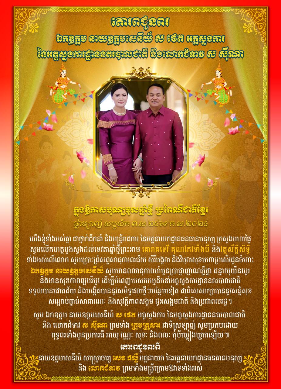 (ភ្នំពេញ)៖ ឯកឧត្ដម នាយឧត្ដមសេនីយ៍ សាស្ដ្រាចារ្យ សេង ផល្លី អគ្គនាយកនៃអគ្គនាយកដ្ឋានធនធានមនុស្ស និងលោកជំទាវ ព្រមទាំងមន្ដ្រីក្រោមឱវាទទាំងអស់ នៃអគ្គនាយកដ្ឋានធនធានមនុស្ស បានផ្ញើសារលិខិតគោរពជូនពរ ឯកឧត្ដម នាយឧត្ដមសេនីយ៍ ស ថេត អគ្គស្នងការ នៃអគ្គស្នងការដ្ឋាននគរបាលជាតិ និងលោកជំទាវ នៅក្នុងឱកាសពិធីបុណ្យចូលឆ្នាំថ្មី ប្រពៃណីជាតិខ្មែរ ឆ្នាំម្សាញ់ សប្តស័ក ព.ស.២៥៦៩។