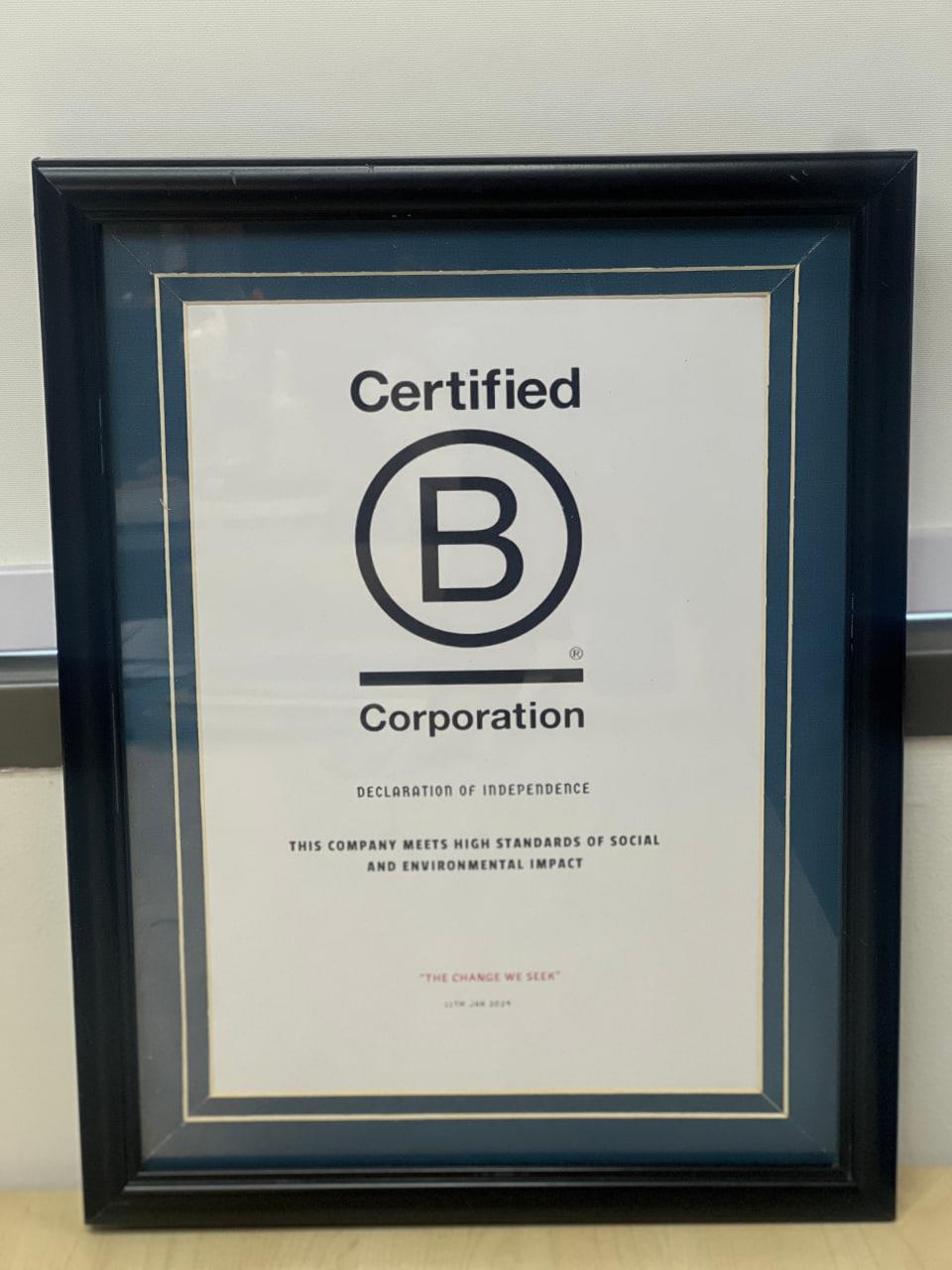 វិញ្ញាបនប័ត្រ B Corp™ បានទទួលស្គាល់ក្រុមហ៊ុន Danone Specialized Nutrition Cambodia ចំពោះអភិបាលកិច្ចល្អ និងការអនុវត្តល្អបំផុតក្នុងការចូលរួមជាមួយសហគមន៍ ការថែរក្សាបរិស្ថាន ការគាំទ្រកម្លាំងពលកម្ម និងការផ្តល់សេវាកម្មអតិថិជនរបស់ខ្លួន។