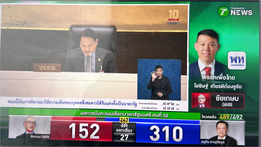 (បាងកក)៖ រដ្ឋសភាថៃ នៅថ្ងៃសុក្រ ទី៥ ខែកញ្ញា បានបោះឆ្នោតជ្រើសតាំងមេដឹកនាំគណបក្សភូមិចៃថៃ លោក Anutin Charnvirakul ជានាយករដ្ឋមន្ត្រីទី៣២របស់ថៃ ជំនួសលោកស្រី Paetongtarn Shinawatra ដែលត្រូវបានតុលាការធម្មនុញ្ញដកចេញពីតំណែងកាលពីសប្ដាហ៍មុន។ តាមរយៈលទ្ធផលបោះឆ្នោតនៅរដ្ឋសភាថៃ នៅថ្ងៃសុក្រនេះ លោក Anutin ទទួលបានសំឡេងគាំទ្រលើសពី ២៤៧ ដែលជាសំឡេងភាគច្រើនដើម្បីជាប់ជានាយករដ្ឋមន្ត្រី ពោលគឺលោកទទួលបានសំឡេងគាំទ្រ ៣១១ ខណៈគូប្រជែងរបស់លោកមកពីគណបក្សភឿថៃ គឺលោក Chaikasem Nitisiri ទទួលបានសំឡេងគាំទ្រ ១៥២សំឡេងក្នុងចំណោមសមាជិករដ្ឋសភាសរុប ៤៨៩រូបដែលមានវត្តមានក្នុងការបោះឆ្នោត។ ចំណែកសមាជិករដ្ឋសភា ២៧នាក់ បានអនុបវាទ។