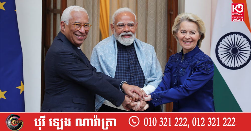 (ញូវដេលី/ព្រុចសែល)៖ ឥណ្ឌា និងសហភាពអឺរ៉ុប (EU) បានសម្រេចកិច្ចព្រមព្រៀងពាណិជ្ជកម្មដ៏ធំមួយនៅថ្ងៃអង្គារនេះ ដែលនឹងកាត់បន្ថយពន្ធគយលើទំនិញភាគច្រើនយ៉ាងច្រើនសន្ធឹកសន្ធាប់ ក្នុងគោលបំណងជំរុញពាណិជ្ជកម្មទ្វេភាគី និងកាត់បន្ថយការពឹងផ្អែកលើសហរដ្ឋអាមេរិក ចំពេលមានភាពតានតឹងផ្នែកពាណិជ្ជកម្មសកល។ នេះបើតាមការចេញផ្សាយ ដោយទីភ្នាក់ងារសារព័ត៌មាន Reuters។