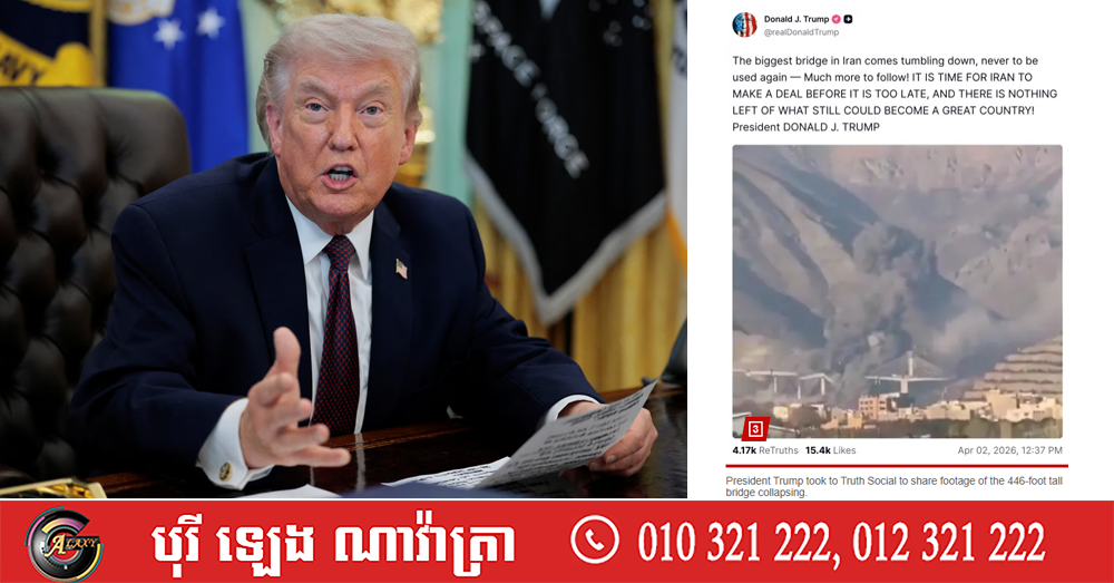 (វ៉ាស៊ីនតោន)៖ ប្រធានាធិបតីអាមេរិក លោក ដូណាល់ ត្រាំ កាលពីថ្ងៃព្រហស្បតិ៍ ទី២ ខែមេសា ឆ្នាំ២០២៦ បាននិយាយថាស្ពានខ្ពស់ជាងគេបំផុតនៅក្នុងប្រទេសអ៉ីរ៉ង់ត្រូវបានកម្ទេច ប៉ុន្មានម៉ោងបន្ទាប់ពីរូបលោកបានគំរាមទម្លាក់គ្រាប់បែក រហូតធ្វើឱ្យអ៉ីរ៉ង់ វិលត្រឡប់ទៅរកយុគសម័យថ្មវិញ។ នេះបើតាមការចេញផ្សាយដោយទីភ្នាក់ងារសារព័ត៌មាន AFP។
