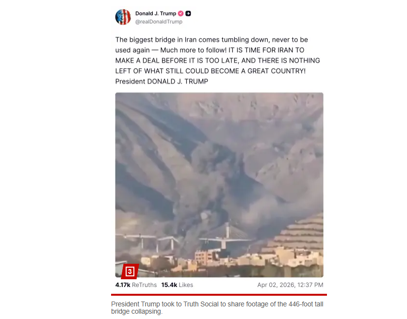 នៅក្នុងការបង្ហោះលើបណ្ដាញទំនាក់ទំនងសង្គមវិញ លោក ត្រាំ បង្ហោះពីរូបភាពផ្សែងហុយខ្មួលខ្មាញ់ចេញពីទីតាំងស្ពាន B1 ដែលស្ថិតនៅចម្ងាយ ៣៥គីឡូម៉ែត្រពីភាគនិរតីពីទីក្រុងតេហេរ៉ង់ ហើយថែមទាំងព្រមានទៀតផងថាការបំផ្លិចបំផ្លាញនឹងបន្តកើតឡើងរហូតទាល់តែអ៉ីរ៉ង់ត្រឡប់ទៅរកតុចរចាដើម្បីបិទបញ្ចប់សង្រ្គាមអូសបន្លាយពេល៥សប្ដាហ៍មកនេះ។