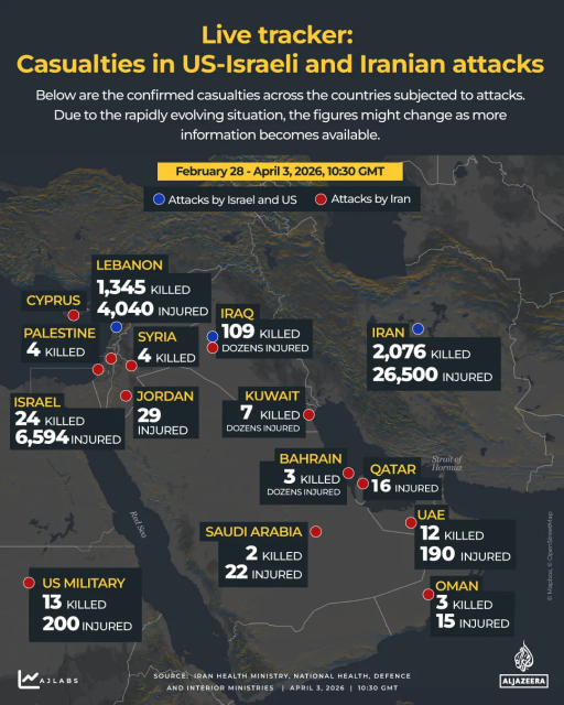 ខាងក្រោមគឺជាតួលេខចុងក្រោយ គិតត្រឹមថ្ងៃទី៥ ខែមេសា ស្តីពីចំនួនអ្នកស្លាប់និងរងរបួសនៅទូទាំងមជ្ឈិមបូព៌ា ចាប់តាំងពីចុងខែកុម្ភៈ ដកស្រង់ចេញពីទីភ្នាក់ងារព័ត៌មាន Aljazeera៖