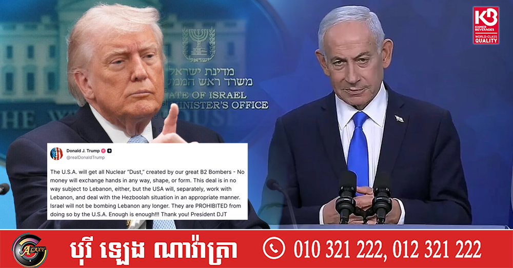 (វ៉ាស៊ីនតោន)៖ ប្រធានាធិបតីអាមេរិក លោក ដូណាល់ ត្រាំ បានប្រកាសជាផ្លូវការថា សហរដ្ឋអាមេរិកហាមឃាត់មិនឱ្យប្រទេសអ៊ីស្រាអែល បន្តសកម្មភាពទម្លាក់គ្រាប់បែកទៅលើប្រទេសលីបង់តទៅទៀតនោះទេ។ នេះបើតាមការបង្ហោះសារនៅលើបណ្តាញសង្គម Truth Social របស់លោក កាលពីពេលថ្មីៗនេះ។
