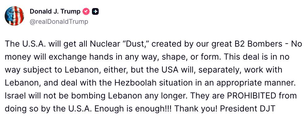 នៅក្នុងសារដែលប្រកបដោយភាពម៉ឺងម៉ាត់នោះ លោក ត្រាំ បានសង្កត់ធ្ងន់ថា អ៊ីស្រាអែលនឹងមិនត្រូវបានអនុញ្ញាតឱ្យបន្តការវាយប្រហារតាមអាកាសនៅក្នុងប្រទេសលីបង់ទៀតឡើយ ដោយលោកបានប្រើពាក្យធ្ងន់ៗថា «ល្មមគឺល្មមហើយ» ។ លោកបានបញ្ជាក់យ៉ាងច្បាស់ថា រាល់សកម្មភាពយោធារបស់អ៊ីស្រាអែលលើទឹកដីលីបង់ ត្រូវបាន «ហាមឃាត់» ដោយសហរដ្ឋអាមេរិកចាប់ពីពេលនេះតទៅ។
