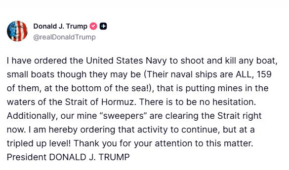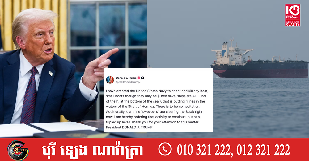(វ៉ាស៊ីនតោន)៖ ប្រធានាធិបតីអាមេរិក លោក ដូណាល់ ត្រាំ បានចេញបញ្ជាឱ្យកងទ័ពជើងទឹកសហរដ្ឋអាមេរិក បាញ់កម្ទេចរាល់ទូករបស់អ៊ីរ៉ង់ណាដែលព្យាយាមដាក់មីននៅក្នុងដែនទឹកនៃច្រកសមុទ្រហ័រមូស ព្រមទាំងបង្កើនសកម្មភាពបោសសម្អាតមីនរបស់អាមេរិកឱ្យបានបីដងបន្ថែមទៀត។ នេះបើយោងតាមការបង្ហោះសារលើបណ្តាញសង្គមរបស់លោកប្រធានាធិបតី។